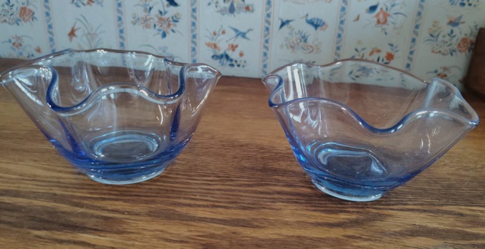 This vintage set of 2 pale blue art glass bowls features a ruffled scalloped edge design. The 6-inch bowls are ideal for display in any room.