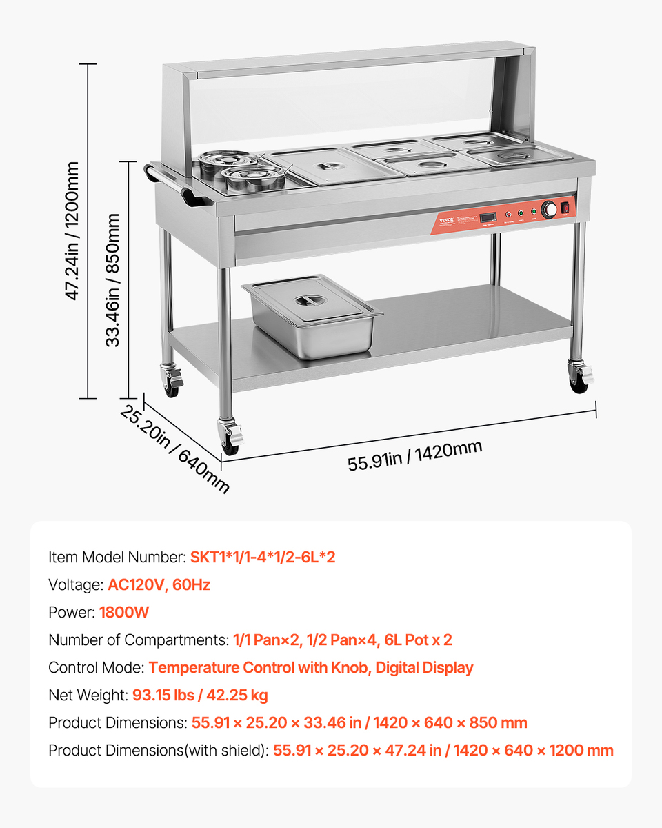 Thoughtful Details: The removable sneeze guard allows customers to select food with security and reliability. The large undershelf is perfect for storing extra tableware and utensils. With a 1.8m power cord and main power switch design, it eliminates distance limitations to outlets. Widely used in cafeterias, hotels, fast food restaurants, supermarkets, and more