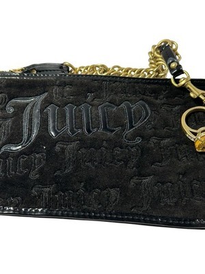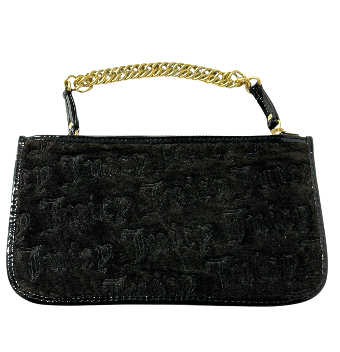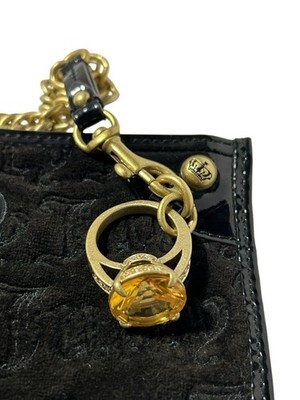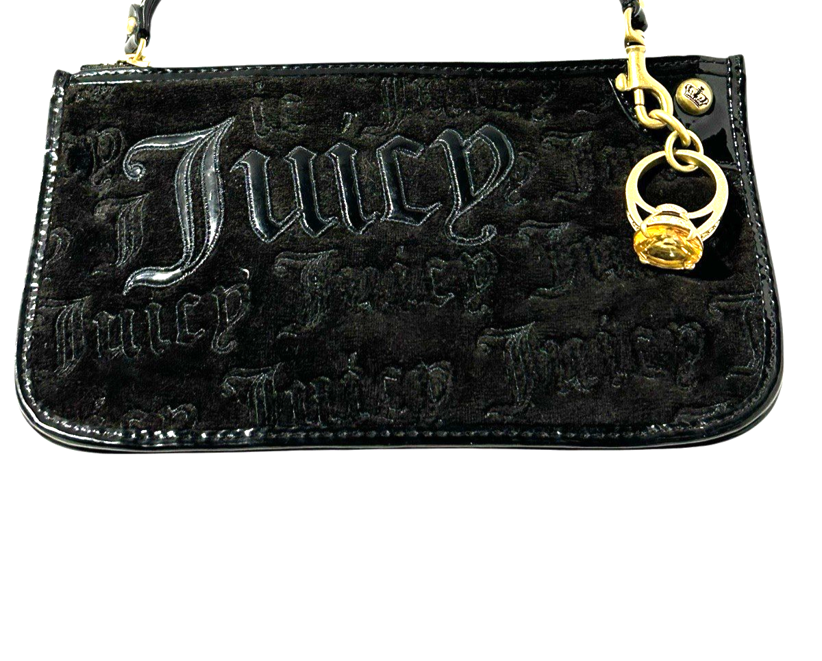 Vtg Juicy Couture Black Velour Leather Y2k Wristlet w/Ring + Carry Chain Strap