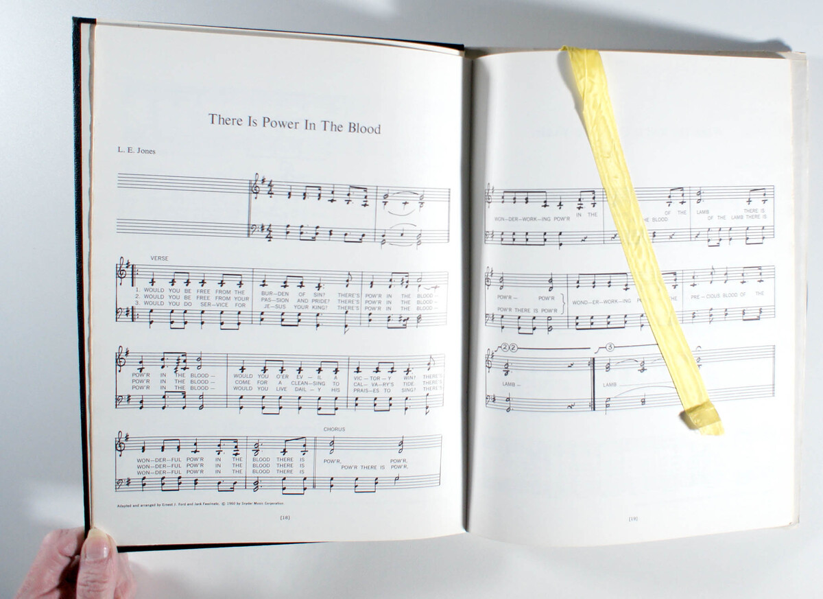 Vinyl plays with occasional crackles (play-graded). Hardcover album package with Hymnal Songbook and attached bookmark shows light wear (front/back). Inner-sleeve is generic white. Spine is easy-to-read, with mild-wear. Minor shelf-wear along top/bottom-edge and corners. Opening is crisp with signs of light use and divots. (Not a cut-out.)