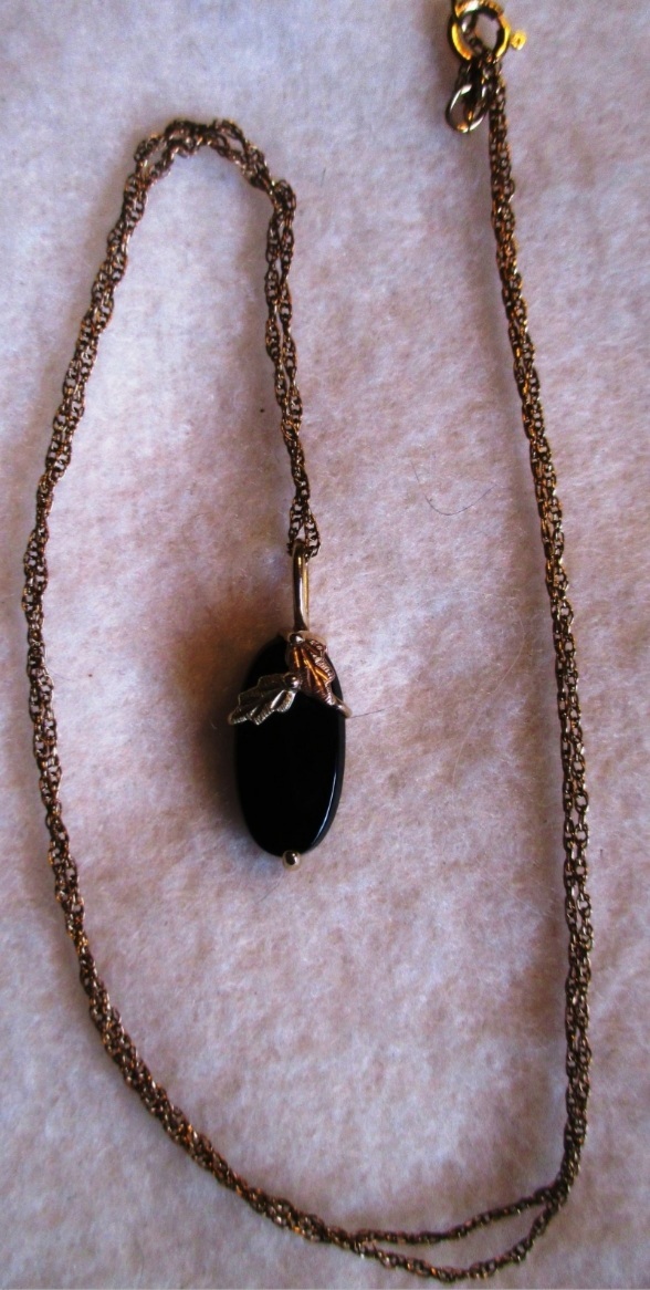 Vintage '80s-'90s. A delicate 10K Black Hills Gold setting with rose gold and green gold leaves holding an oval Black Onyx stone. Created by Coleman Co Jewelers in the late 1980s or early 1990s the 17mm by 8mm polished cabochon onyx is framed in a traditional Black Hills Gold leaf design suspended on a delicate, 19", 1/20 14k gold-filled Prince of Wales link chain. Closure is a working spring ring. Signed. A lovely way to wear this beautiful healing stone. In excellent condition.
