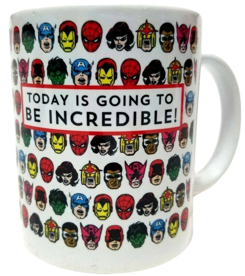 This Marvel Comics character faces mug features a collage of superhero headshots and the text "TODAY IS GOING TO BE INCREDIBLE!". It is an officially licensed ceramic mug produced by Moonpig.