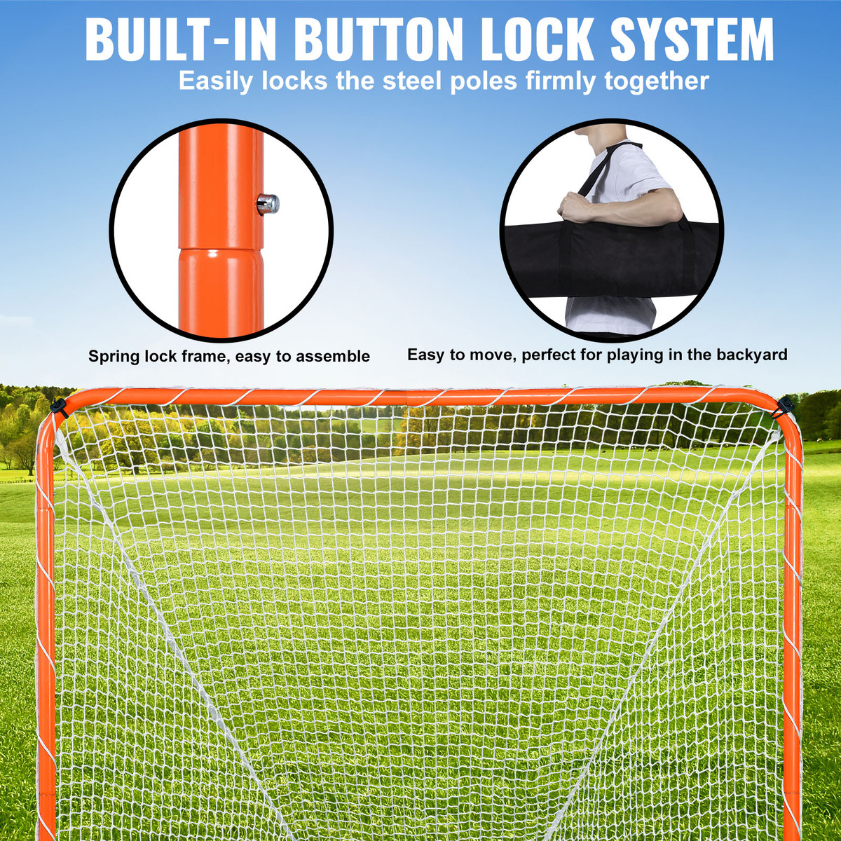 Easy Installation: This lacrosse goal comes with a built-in snap-locking system that securely locks the steel poles together with ease.
