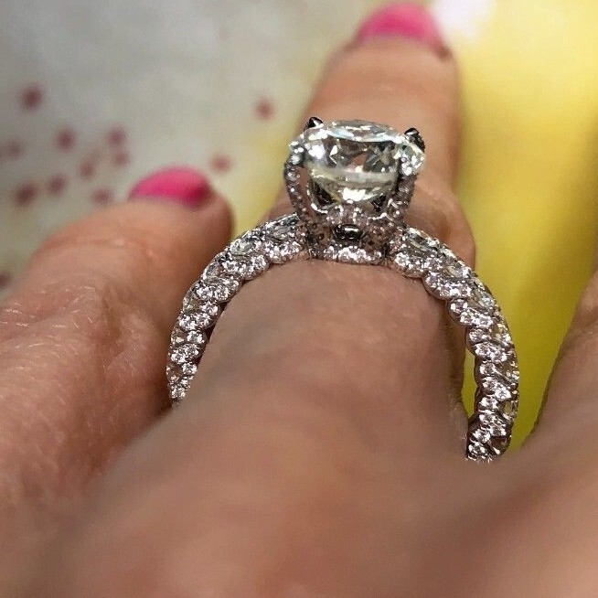 Magnificent Diamond Engagement Ring zeigt einen atemberaubenden 2,01 -CARAT GIA -zertifizierten Rund -Cut -Solitaire -Diamanten. In V-formigen Zinken in der Mitte eines Eternity Shank mit runden brillanten Diamanten eingestellt, die dem Ring eine zusatzliche sparkle und reine Eleganz verleihen. Dieser bemerkenswerte Diamantring wird von 950 Platin gefertigt.