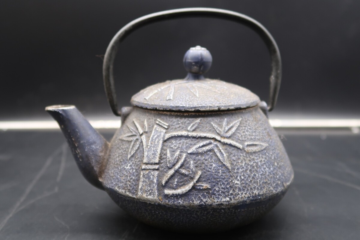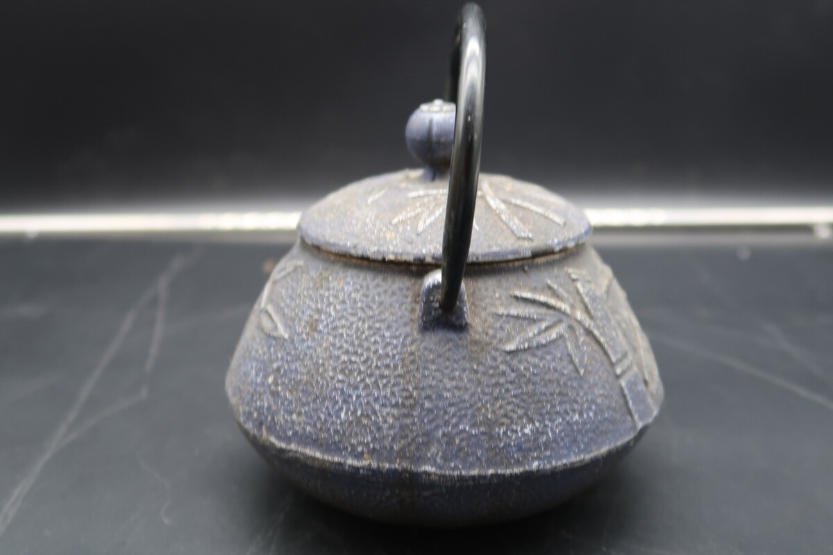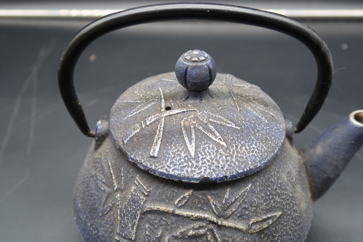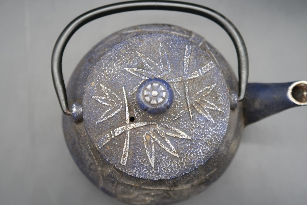 Vtg Japanese Tetsubin Tea Kettle Pot Cast Iron Pine Bamboo & Blossom Blue Silver