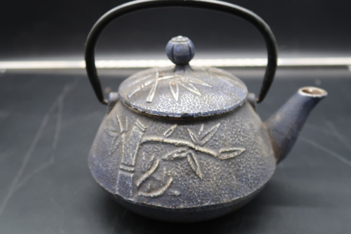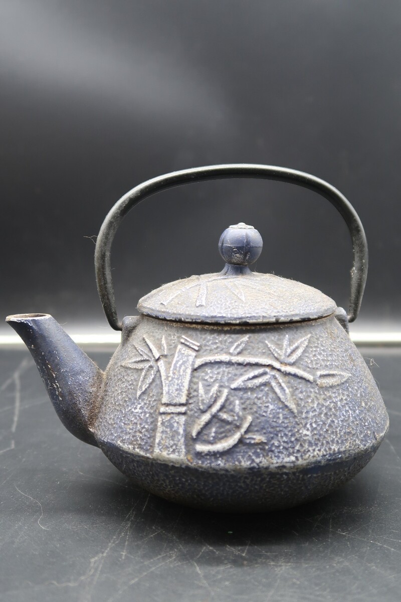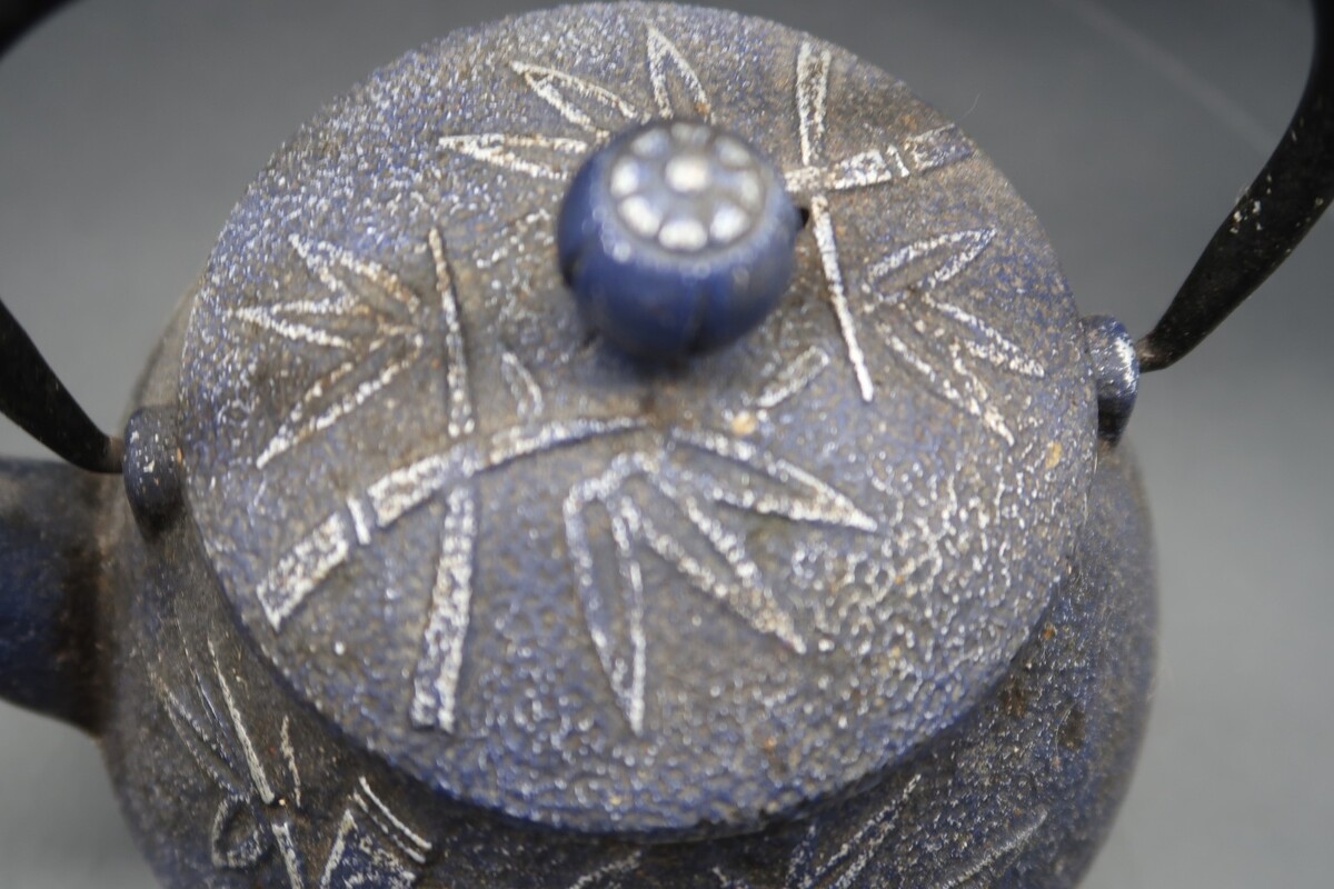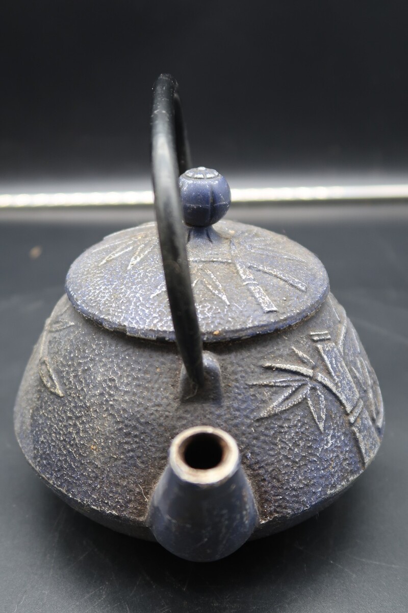 Vtg Japanese Tetsubin Tea Kettle Pot Cast Iron Pine Bamboo & Blossom Blue Silver