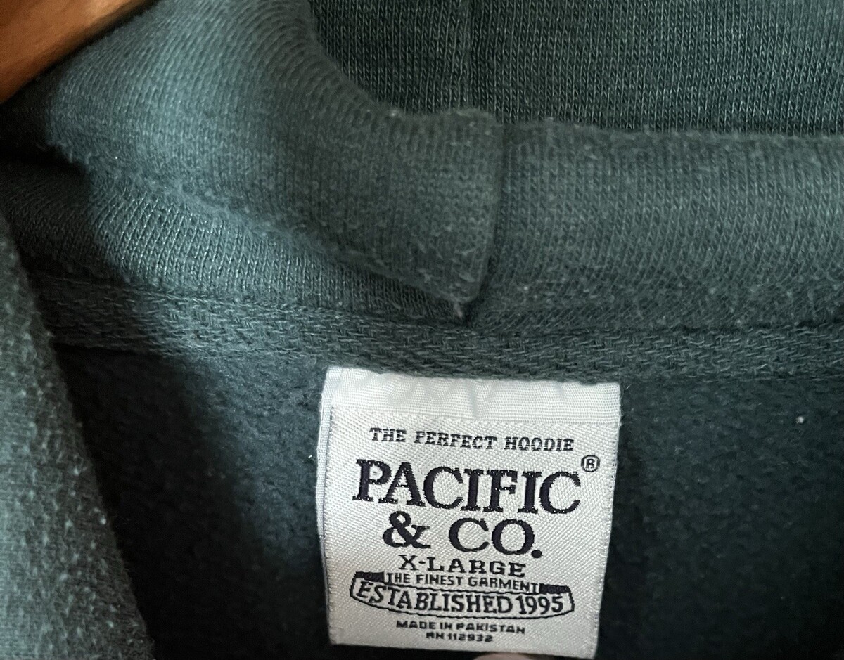 The product is a men's XL green and white printed hoodie sweatshirt featuring a beach theme. Made of cotton fleece material, this pullover hoodie by Pacific Co is perfect for all seasons. The long sleeve hoodie has a graphic print design, making it a stylish choice for beach activities or casual wear.