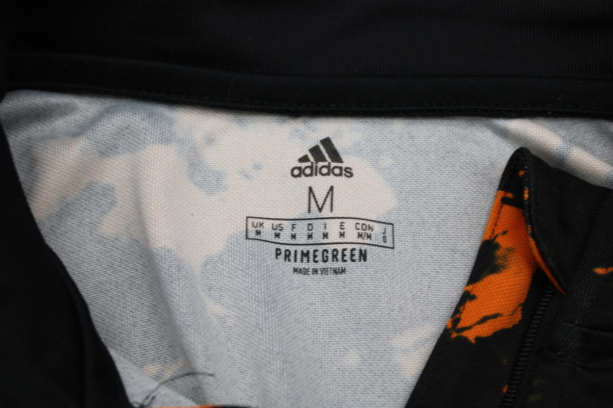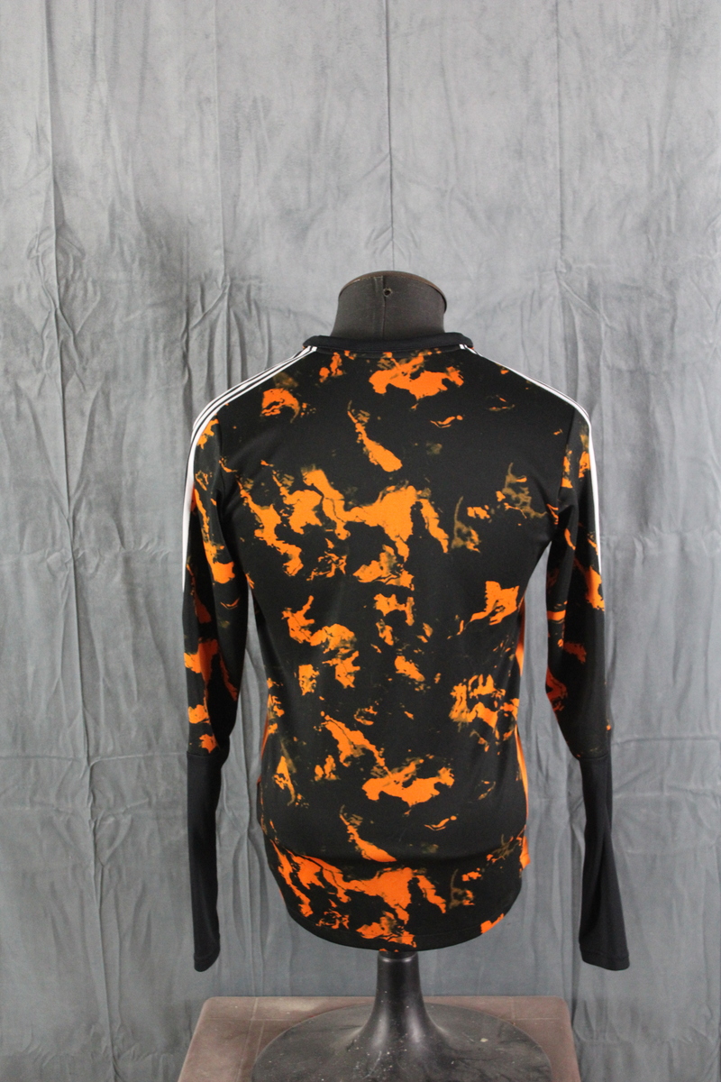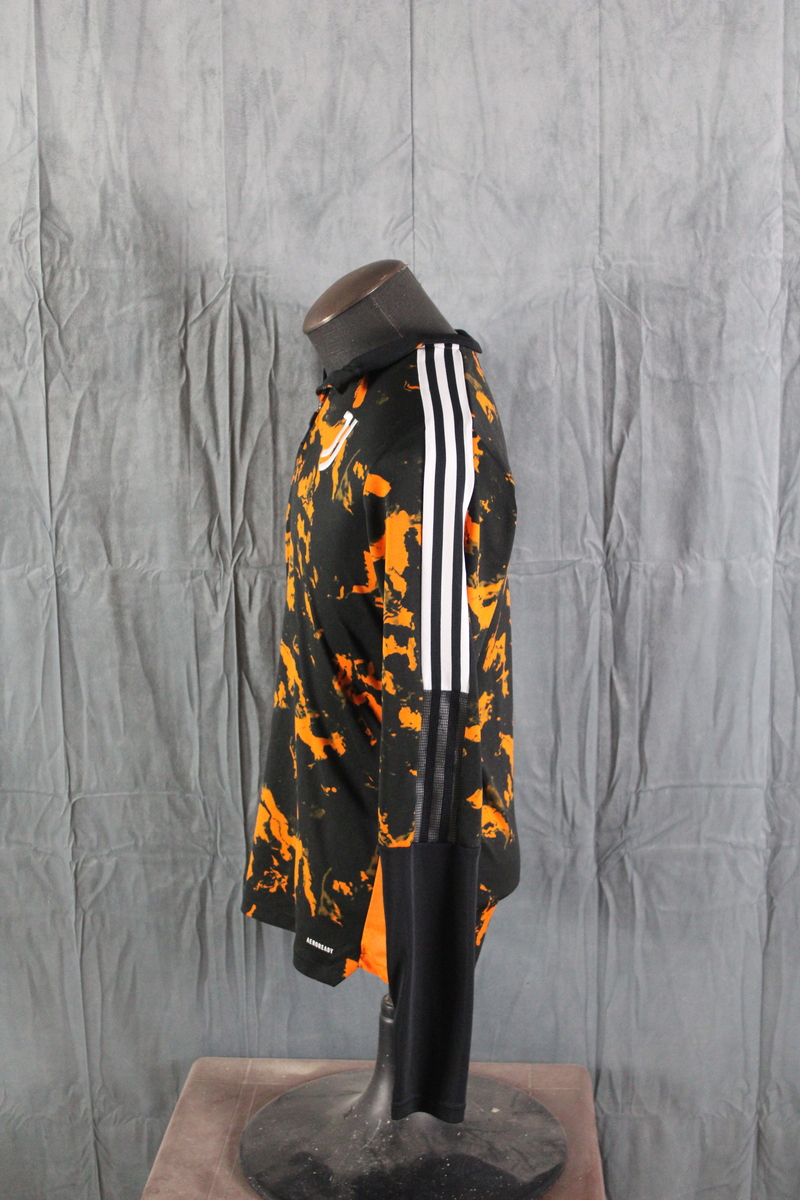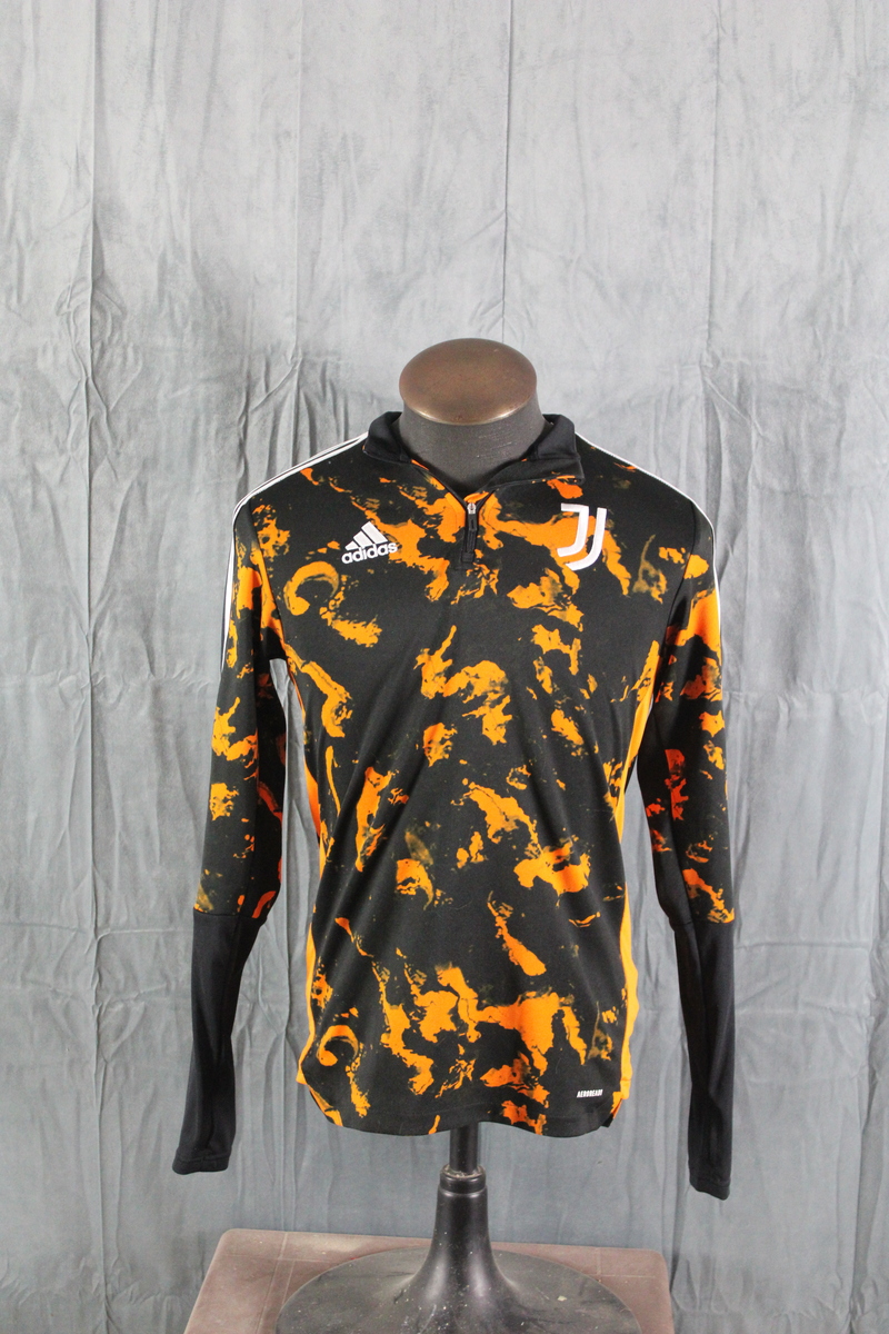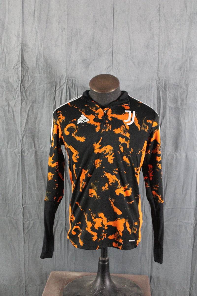 Up for sale is a Juventus jacket. It has an orange base colour with a black splatter pattern over the top. front of the jacket has the Juventus and Adidas logos stitched in white. What a great jacket do not miss out on it.
