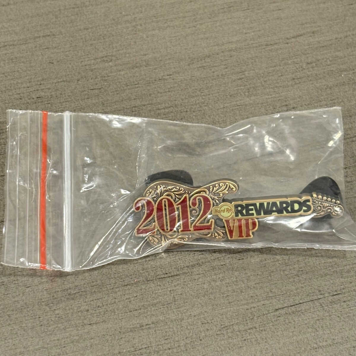 Unique 2012 Hard Rock Rewards VIP pin with intricate guitar design, collectible appeal, and durable rubber backings for secure wear.