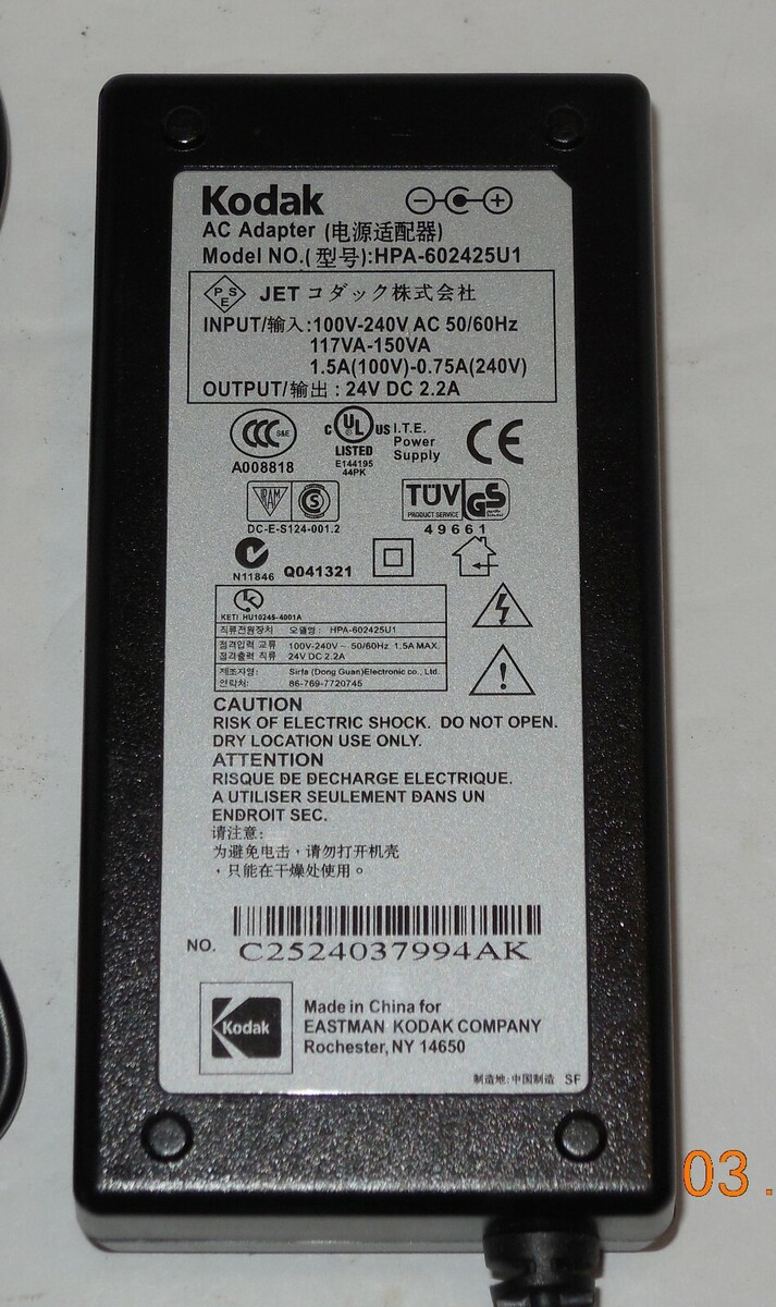 for sale is for a Kodak AC Power adapter HPA-602425U1 Input 100-240v Output 24v OEM Replacement. Tested and Works. this listing is ONLY for the part that is pictured. Please see pictures prior to purchasing. Please ask any and all questions prior to purchase. Fast same or next day shipping with Delivery Confirmation.
