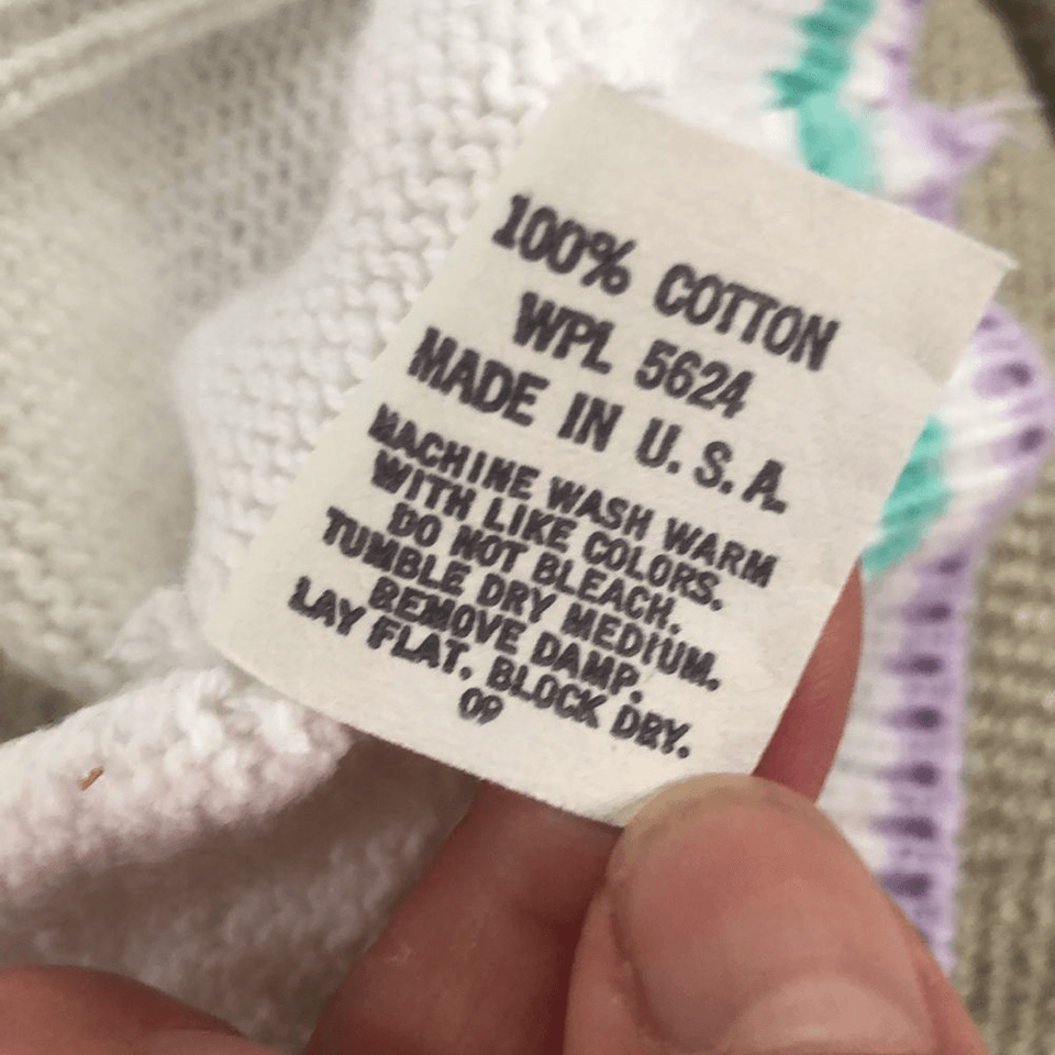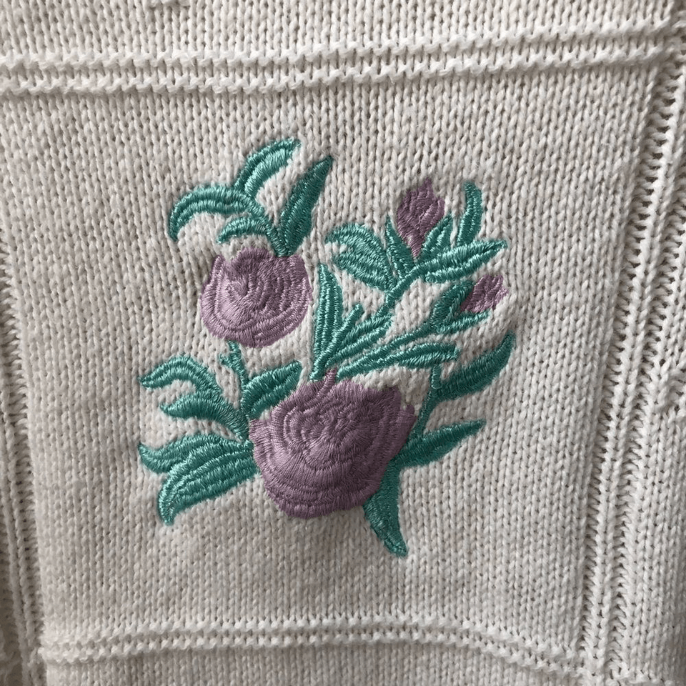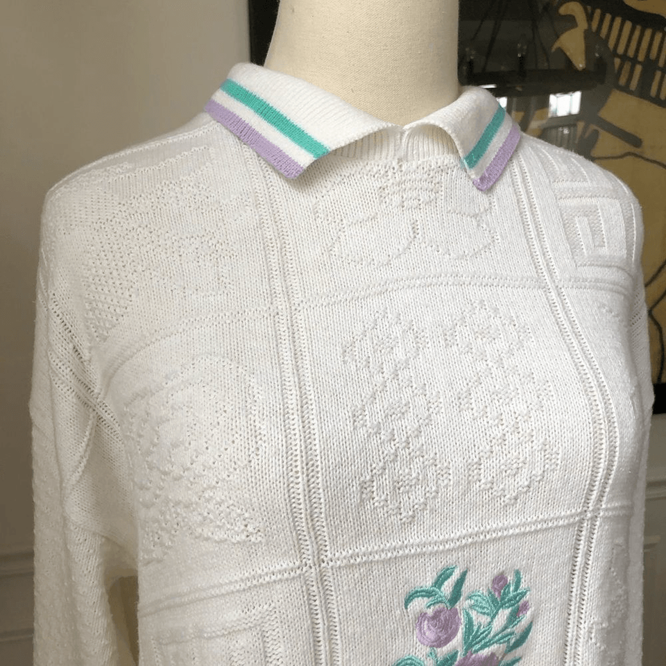 Vintage winners choice 100% cotton knit sweater made to look like quilting squares with embroidered purple and green flower front and center, and green and purple trim Around the waist, cuffs and polo collar. 80s 90s era. Laying flat measures 26 inches shoulder to hem and 21.5 inches from armpit to armpit.