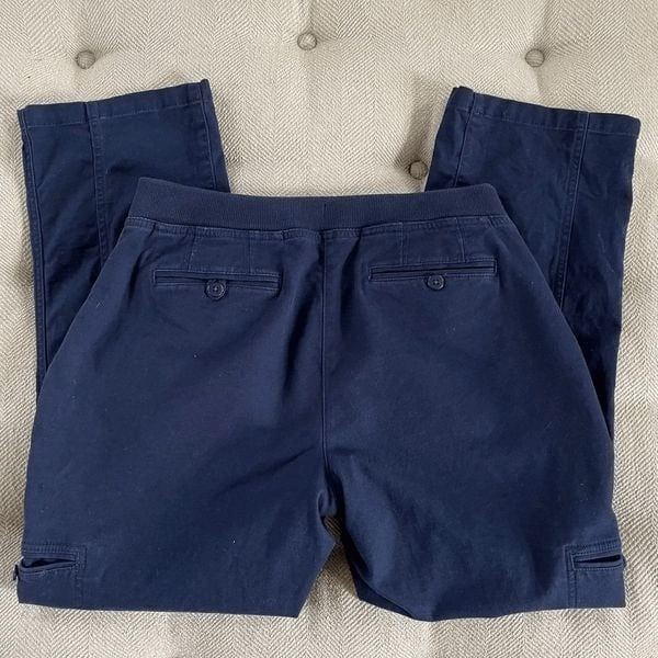 L.L. Bean classic fit pants with button and zip closure and a stretchy knit waistband for a comfortable fit. Hip pockets and two flat thigh pockets. Cotton and spandex blend. Measurements are approximate and taken while laying flat: 15 inches straight across the waist with a 10 inch rise and a 27.5 inch inseam