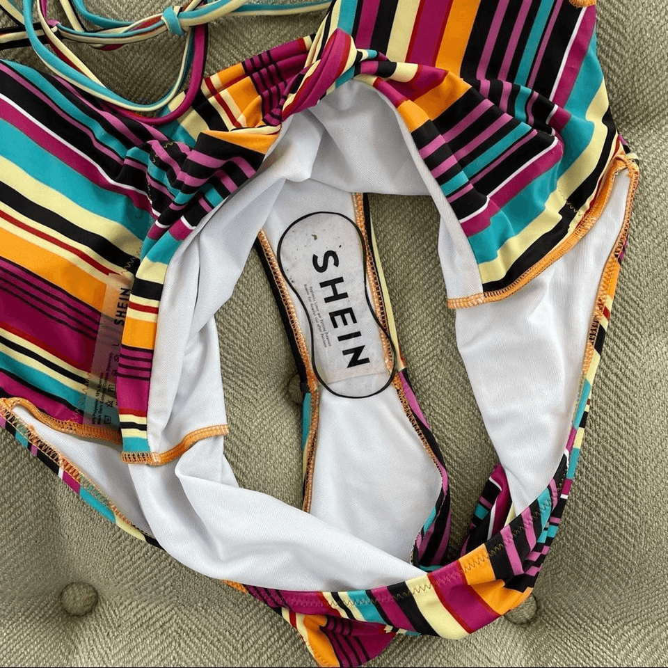 Shein Rainbow stripe plunging neckline one piece swimsuit. New, never worn however there are no tags and while I was putting it on my display torso The hygienic sticker got caught and pulled off. I still have it though and I stuck it back , but it was accidentally removed. Ties at the back of the neck. The tails are incredibly long and I cannot figure out why. I would probably cut them down