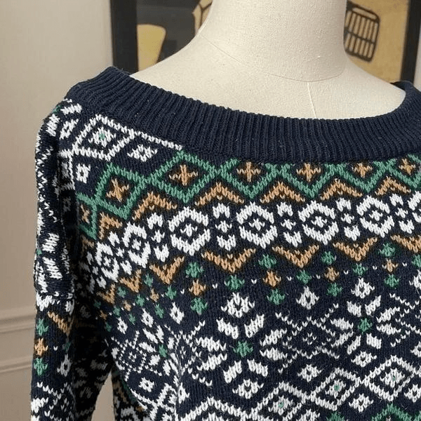 BDG from Urban Outfitters dark blue cropped fair isle Nordic Intarsia sweater. Laying flat measures approximately 15.5 inches from shoulder to hem and 21 inches from armpit to armpit.