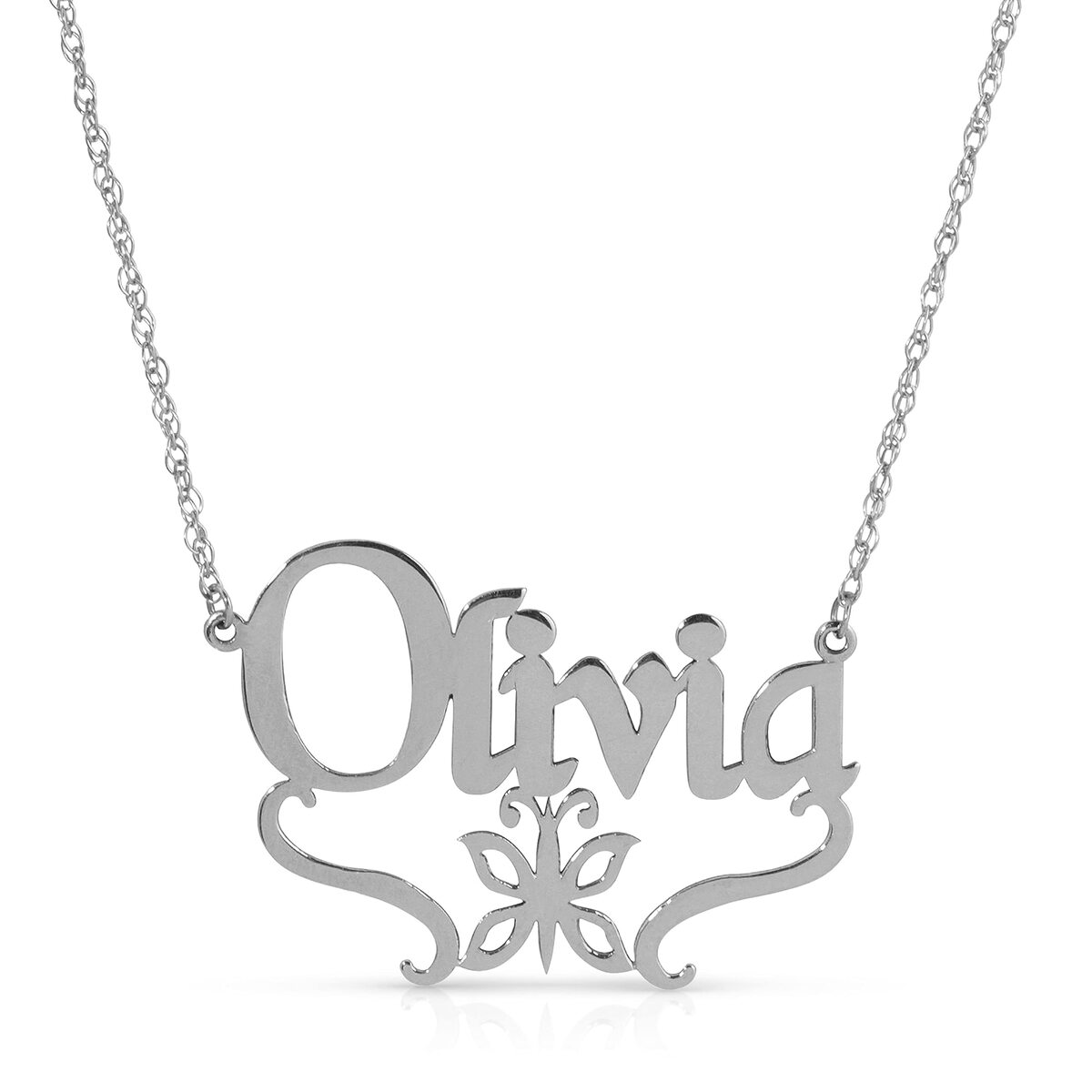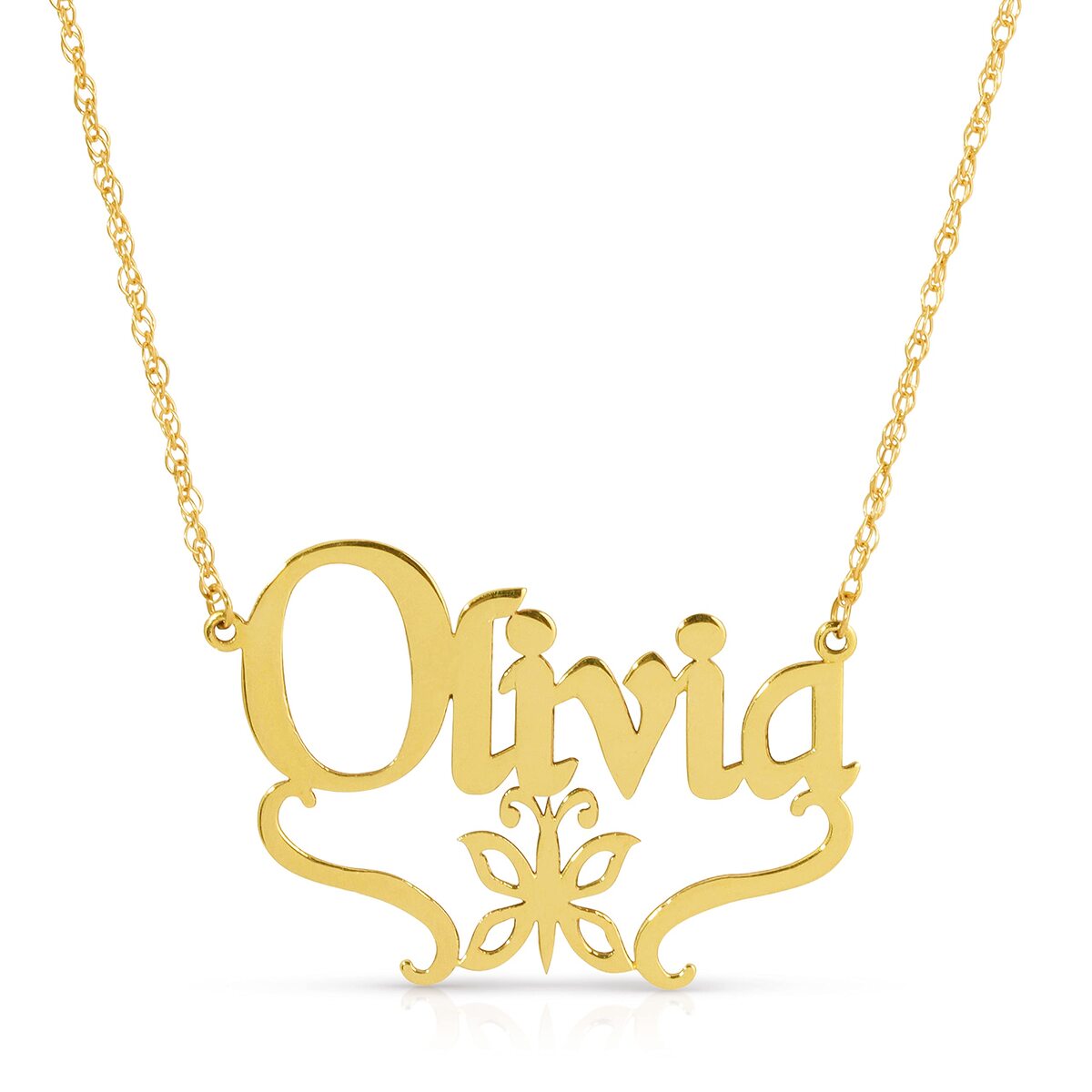 14K. SOLID GOLD NECKLACE PERSONALIZED NAME NEW BOROUGH WITH BUTTERFLY FONT