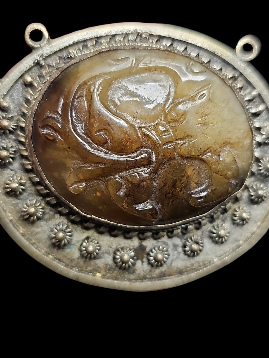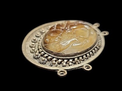 The carved stone is set within an ornate silver-tone mount decorated with raised floral and geometric detailing. Multiple perimeter loops are integrated into the frame, suggesting this piece was intended as a necklace centerpiece or decorative element, rather than a simple single-bail pendant. The construction gives the medallion substantial visual presence and versatility for wear or display.