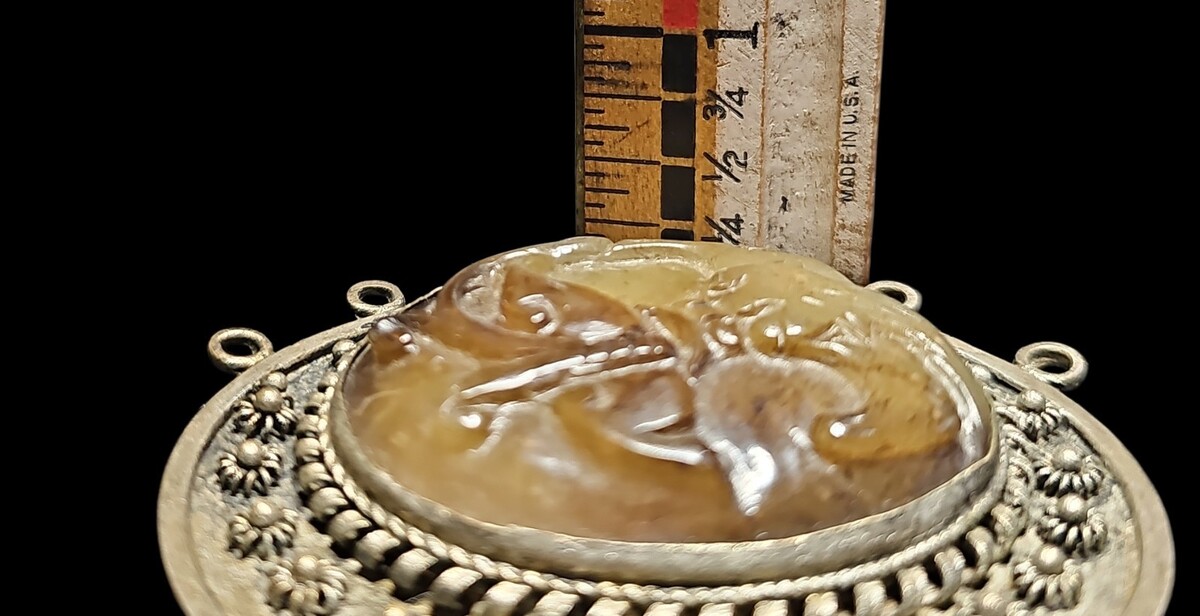An intriguing vintage carved stone medallion that bridges the line between adornment and artifact, appealing to collectors of chalcedony carvings, ethnographic-inspired jewelry elements, and bold statement pendants with old-world character.