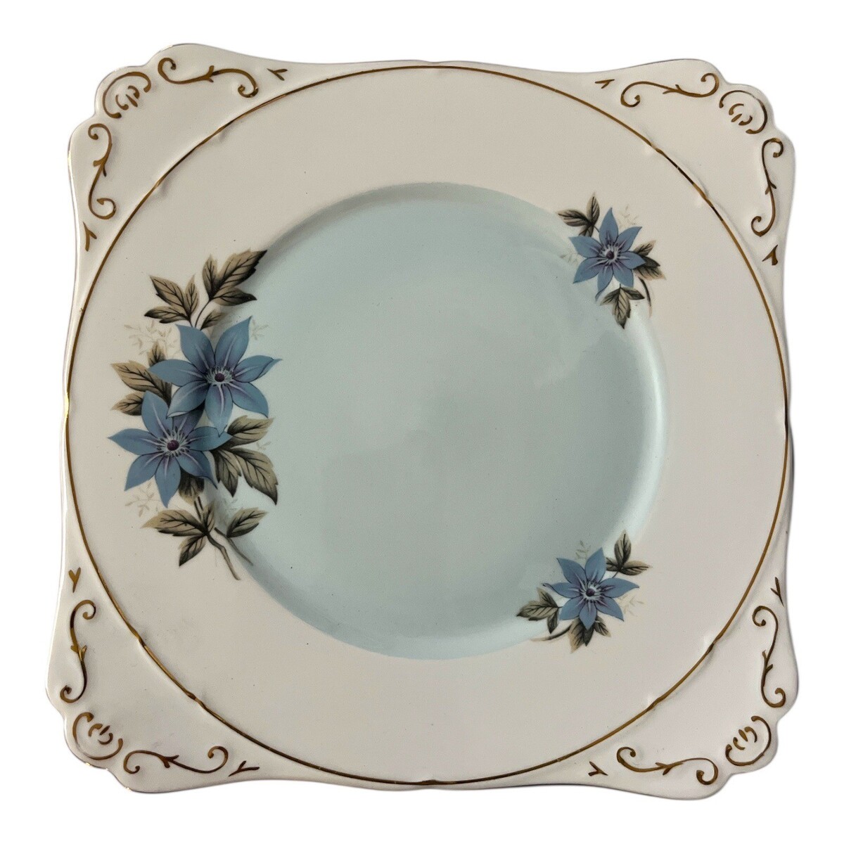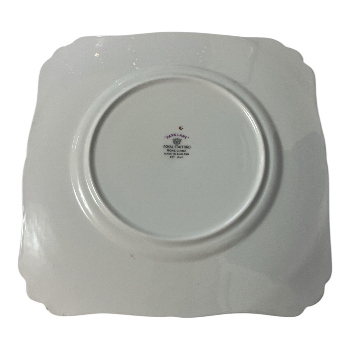Elegant Royal Stafford bone china plate in the Park Lane pattern, made in England. This classic square plate features a soft blue center with delicate blue floral motifs and gold scroll accents along the rim. The refined design and quality bone china make it suitable for display, special occasions, or completing a vintage English table setting. Appears unused, with no chips, cracks, or crazing observed.