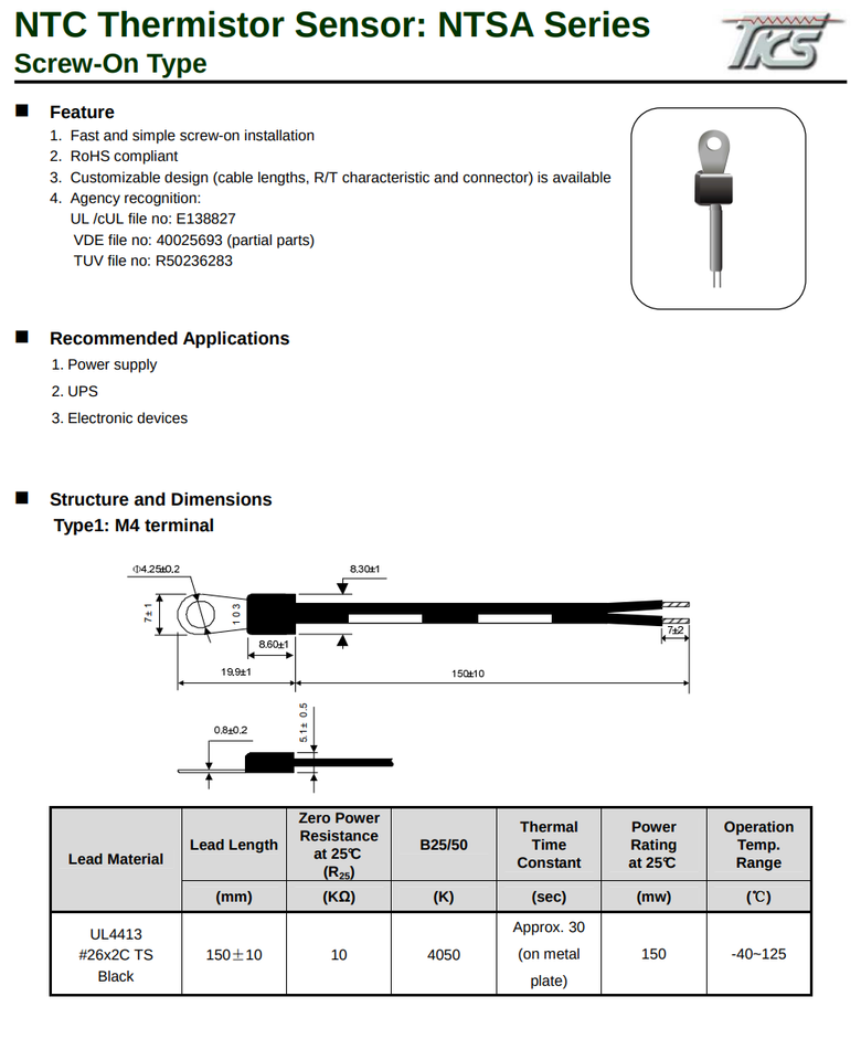 NTSA0103FZB71 THINKING 10K NTC Thermistor Sensor Ring Lug + Connector
