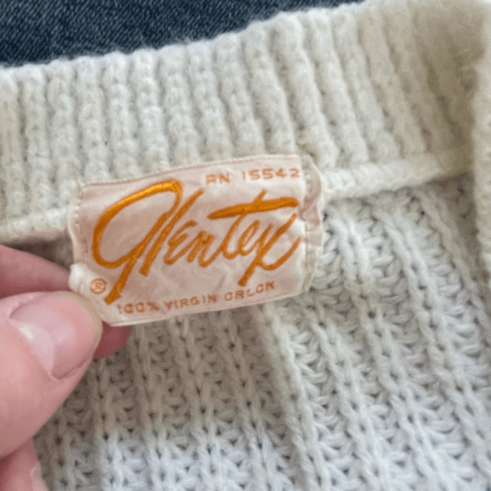 60s Glentex shaker knit cropped V-neck sweater vest in ivory with three button closure. Made out of 100% virgin orlon. This is a nice vintage piece that would make a great closet staple and is currently on trend. Laying flat measures 18 inches shoulder to hem and 18 inches armpit to armpit. No noted flaws. No size tag, but based on the measurements I estimate this to be approximately a women?s size small. Please double check measurements to ensure the proper fit for you.