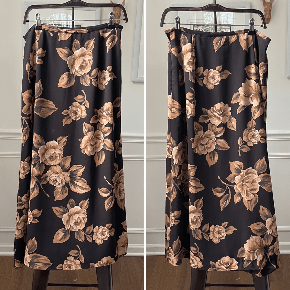 Vintage 90s Chaus 100% polyester lined longer Prairie or cottagecore skirt. Southwestern cabbage rose print in desert hues of brown and goldish tan. Side zip closure. There was also a small tab with a snap on it but half of the snap is missing. Still wears fine In my opinion. A bit of the hem has dropped. Could easily be fixed with double sided fabric tape or a handy person could Tack it up with a few stitches. I am not a handy person so I would use tape. Lol. See pics. 100% polyester. Laying flat measures 15.5 inches straight across the waist, 21 inches across the hip and 35 inches long. Pioneer woman cowgirl. Yellowstone.