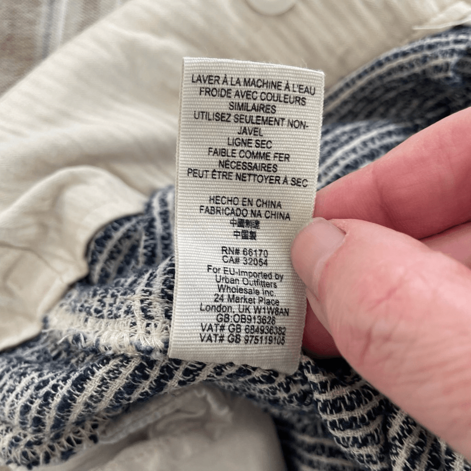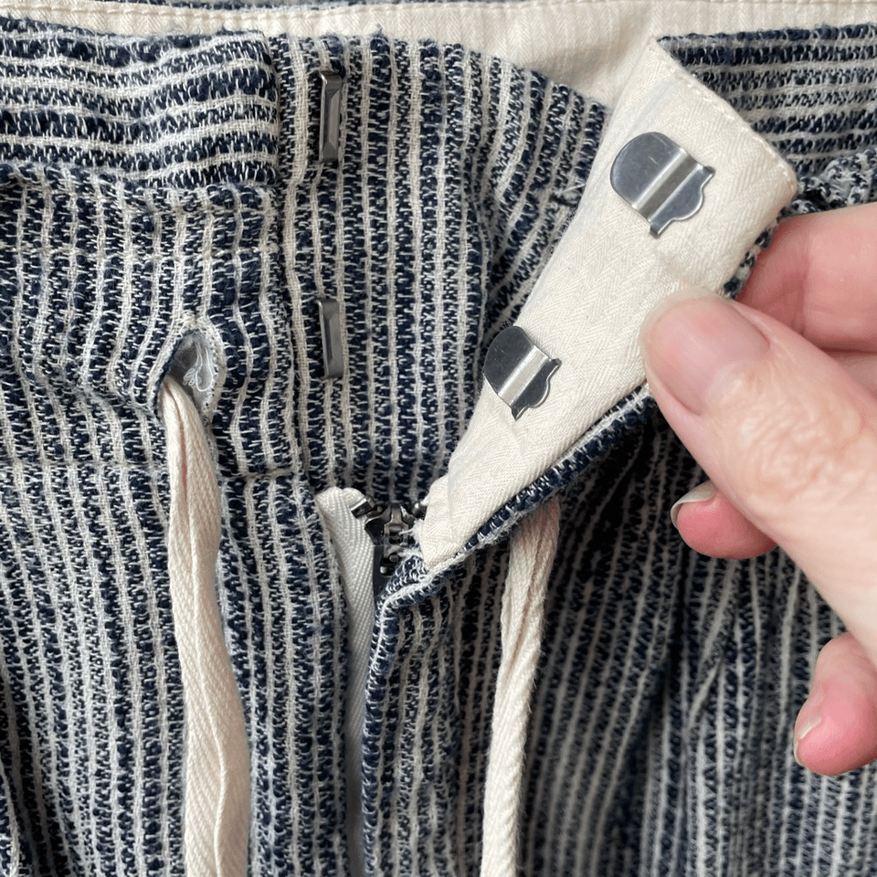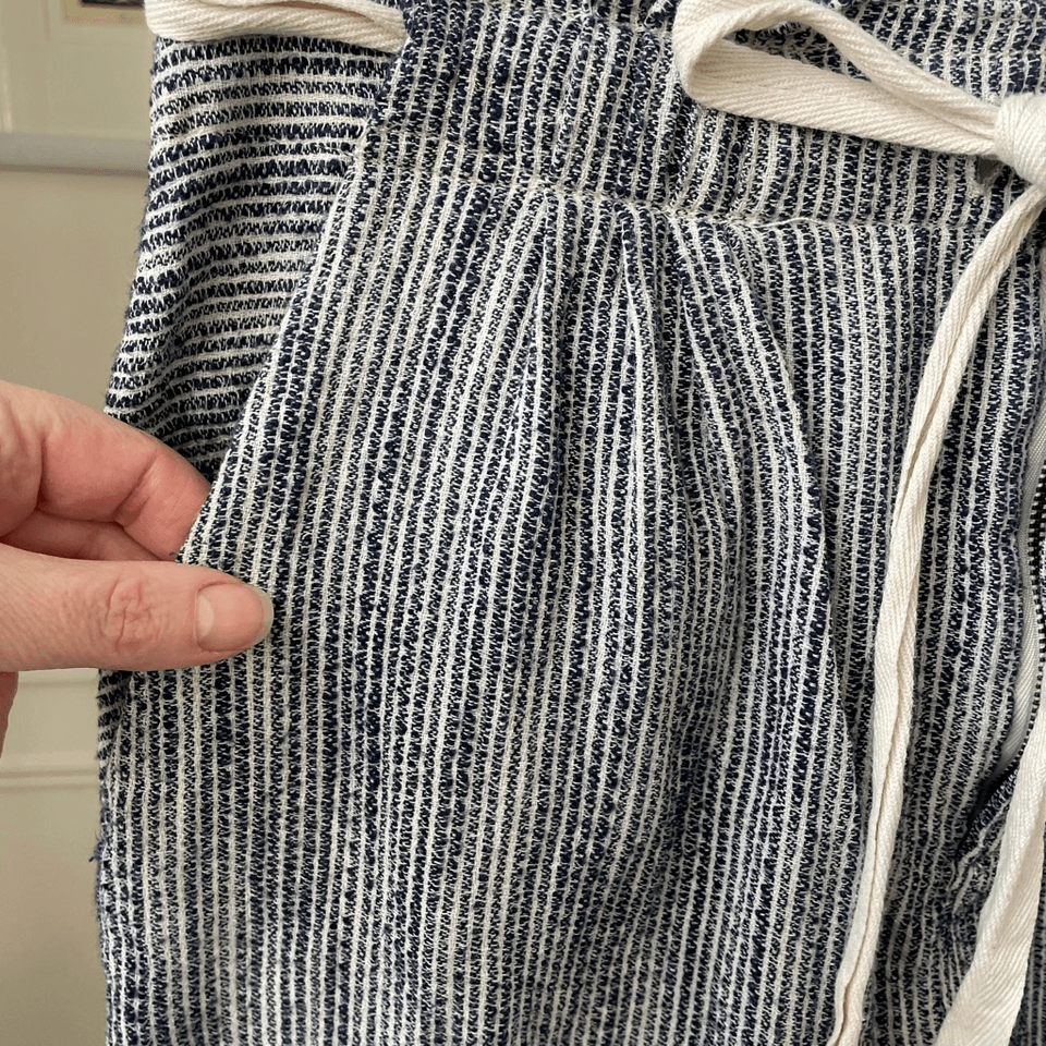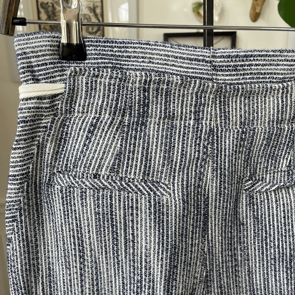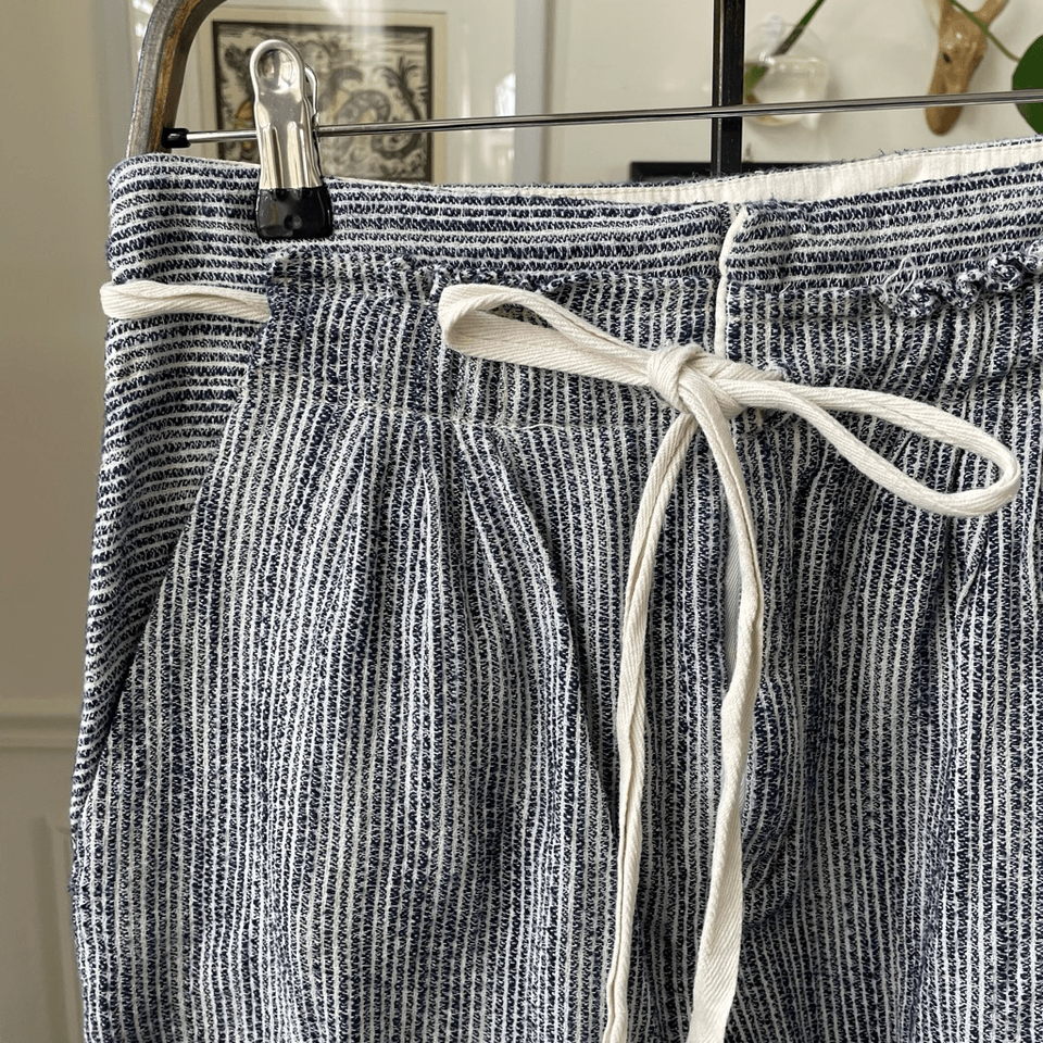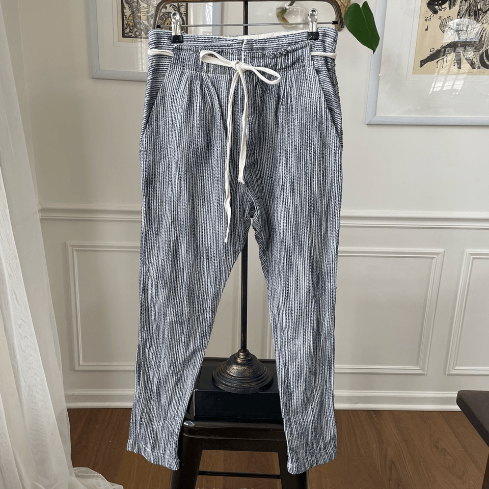 Women?s free people, 100% cotton, blue and white, striped textured taper pants with zip and double hook fly and tie waist. Hip pockets and two faux back welt pockets. Actually, now that I look, they aren?t fake pockets. But they are still stitched shut. Front pleat and taper legs With a 26 inch inseam high-rise at 12 inches and 14 inches straight across the waist. Tag size 4.