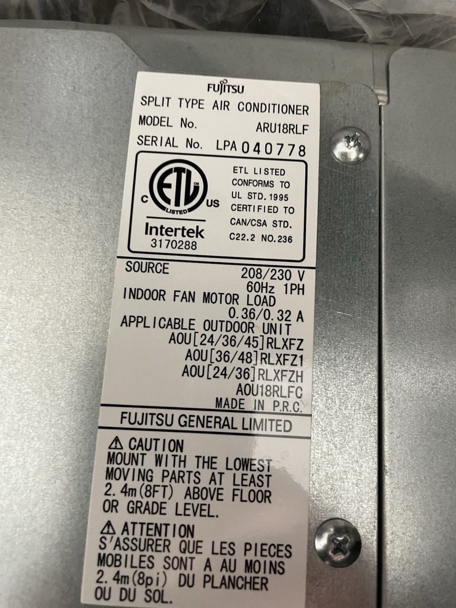 18,000 BTU Single OR Multi Zone Concealed Duct Air Handler Fujitsu ARU18RLF