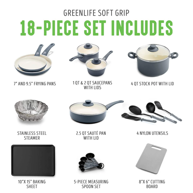 The GreenLife 18-piece cookware set with soft grip technology is all about comfort and control. Designed for effortless performance and cleanup, this set features our toxin-free Thermolon nonstick coating. GreenLife?s healthy ceramic nonstick is not stuck in the past?that?s why our ceramic nonstick starts with sand and creates 60% less CO2 emissions during the curing phase than traditional coatings. The pans are also crafted with recycled aluminum, because we want your kids? kids to cook healthy, too. Finished in vibrant colors, this set is outfitted with stay-cool handles to keep your cooking comfortable. Durable glass lids for a good look at any meal in progress without sacrificing heat. For all stove tops, except induction. Oven safe to 350F. Dishwasher safe. This cookware set includes: 7" and 9.5" open fry pans, 1-quart and 2-quart covered sauce pans, 4-quart covered Casserole, 2.5-quart covered saute pan, stainless steel steamer, 10x15 inch baking sheet, 8x6 inch cutting board, 4 nylon utensils, and 5-piece measuring spoon set!