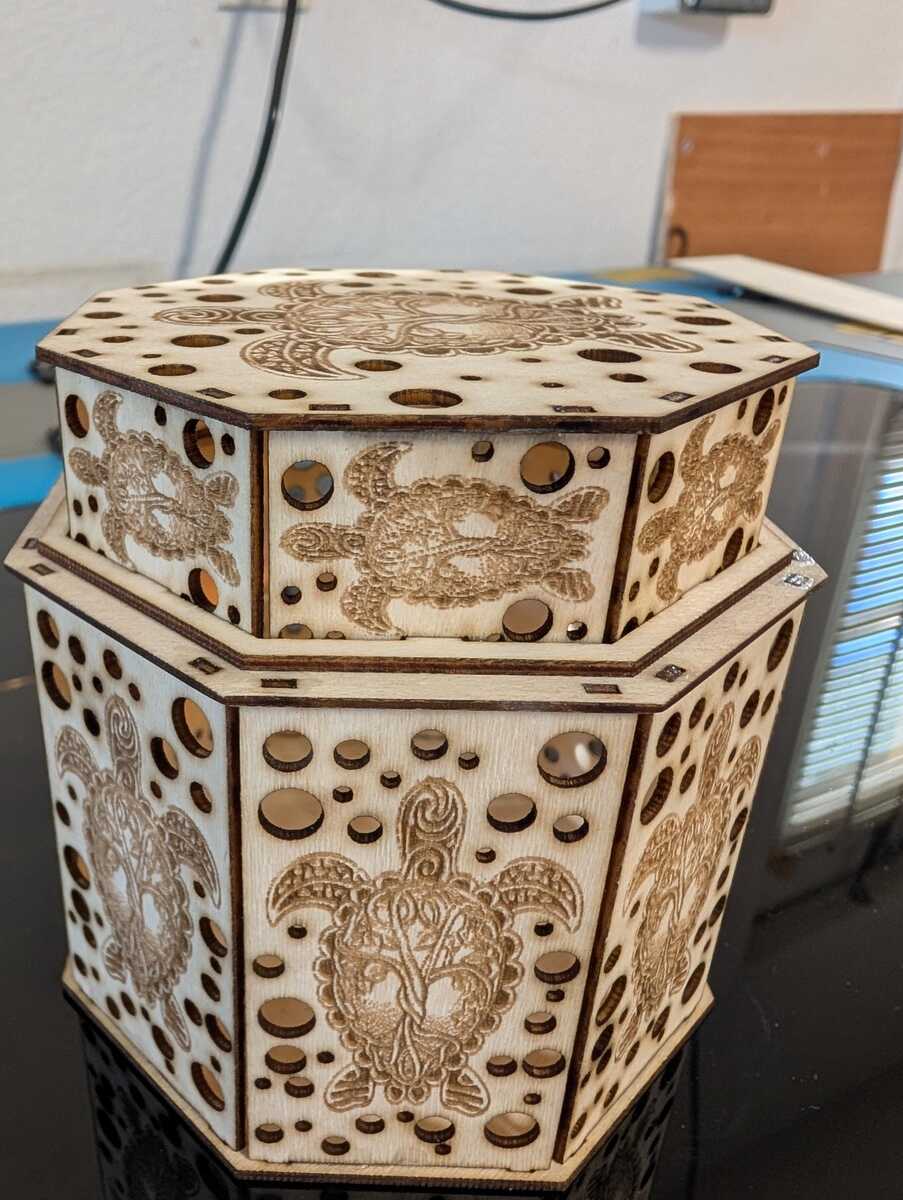 Discover the perfect blend of artistry and craftsmanship with this handcrafted laser-cut wooden tabletop lantern. Featuring the timeless sea turtle and Tree of Life design intricately engraved on every side and the lid, this elegant hexagonal box is a true symbol of growth, strength, and connection.