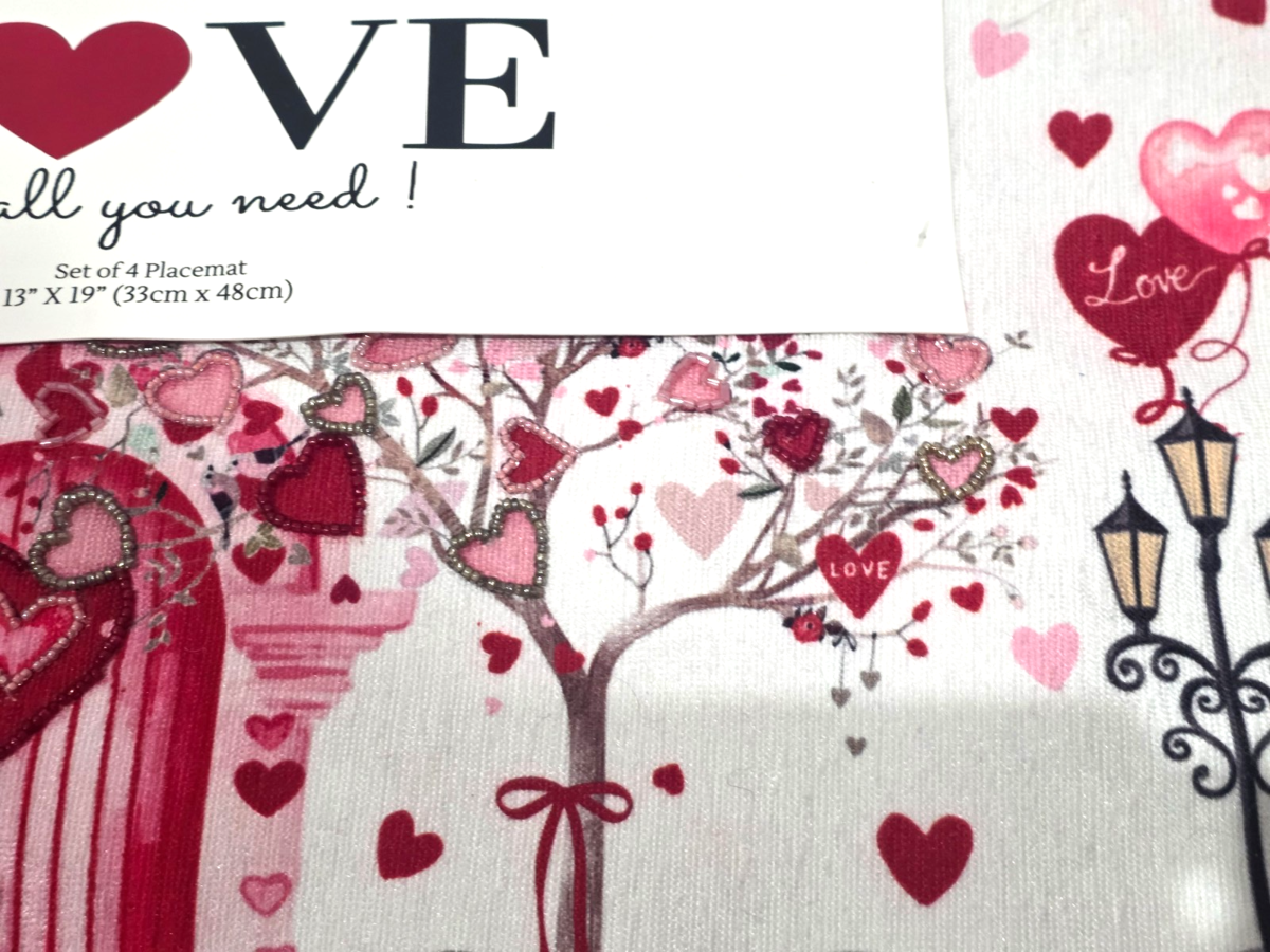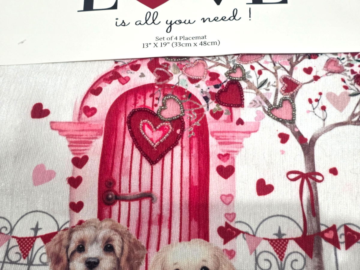 Up for sale we have these adorable placemats for your Valentines Decor. These are sooo pretty! They have 2 small puppies and some of the hearts have beading on them. Size 13" x 19". New set of 4.