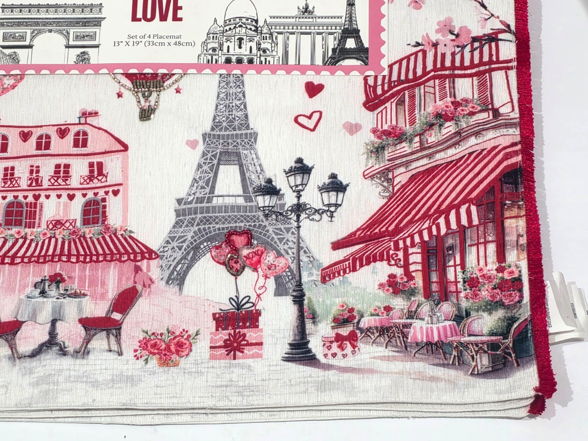 Up for sale we have these adorable placemats for your Valentines kitchen Decor. These are sooo pretty! They have paris theme with the Eiffel tower and cute cafes. Size 13" x 19". New set of 4.