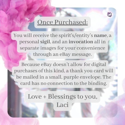 Once purchased, You will receive the spirit?s/entity?s name, a personal sigil, and an invocation all in separate images for your convenience through an message. Please give me some time in case I am asleep or otherwise occupied. I will send everything along as soon as I can.