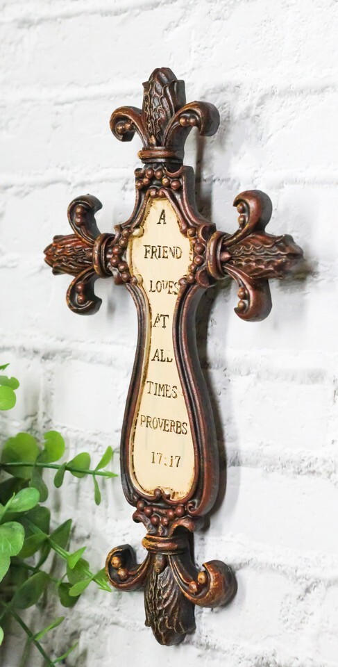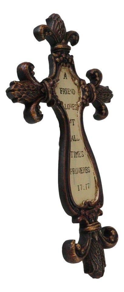 ? Add a touch of timeless elegance to your home with the Small Rustic Tuscany Fleur De Lis "A Friend Loves at All Times" Proverbs Faux Distressed Wooden Wall Cross. This beautifully crafted piece combines rustic charm with a meaningful message, featuring a fleur de lis design and a heartfelt Bible verse that celebrates the enduring bond of friendship. The faux distressed wood finish enhances its vintage appeal, making it a perfect addition to any living room, entryway, or gift for a dear friend.