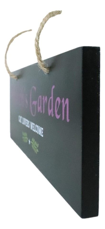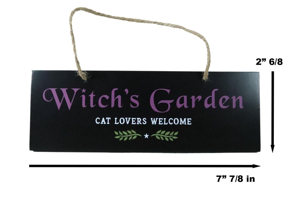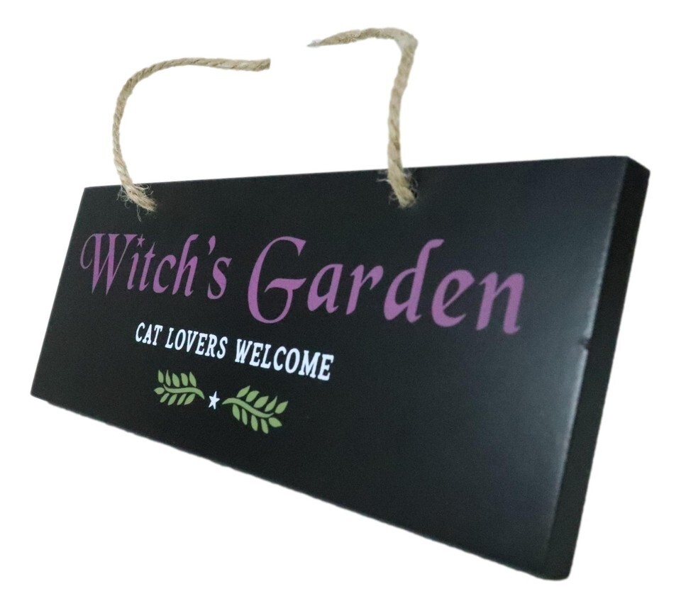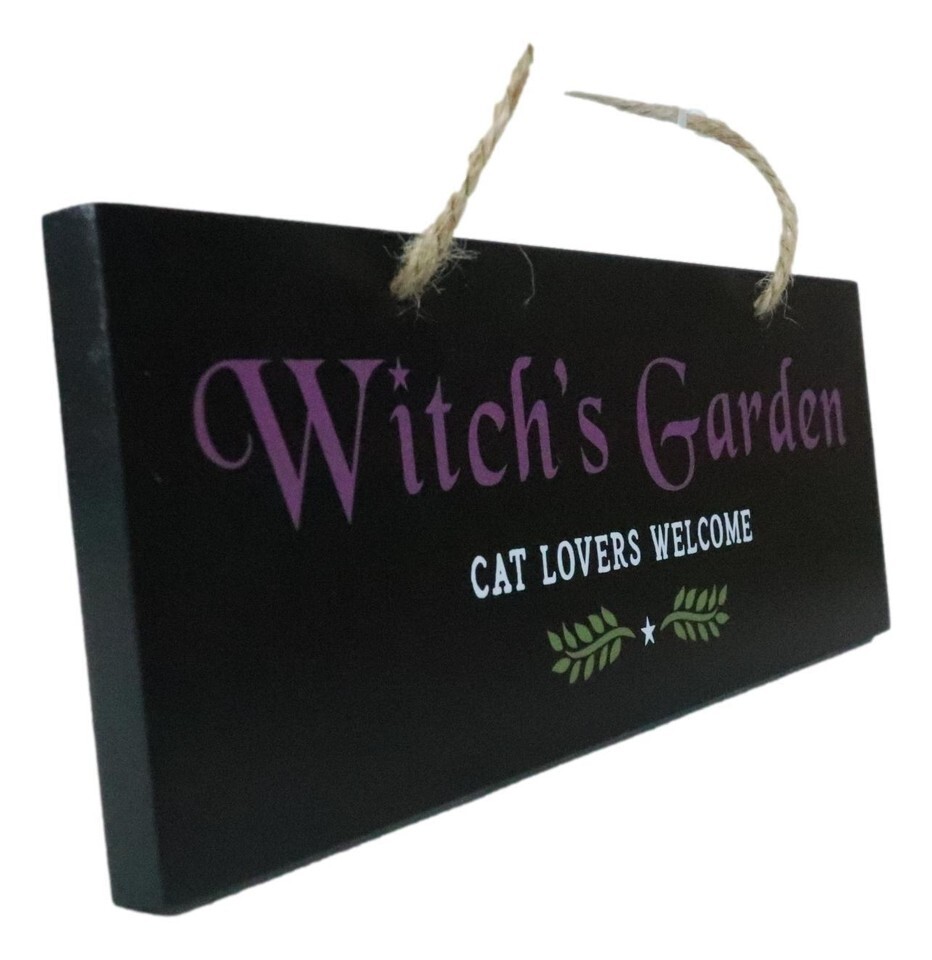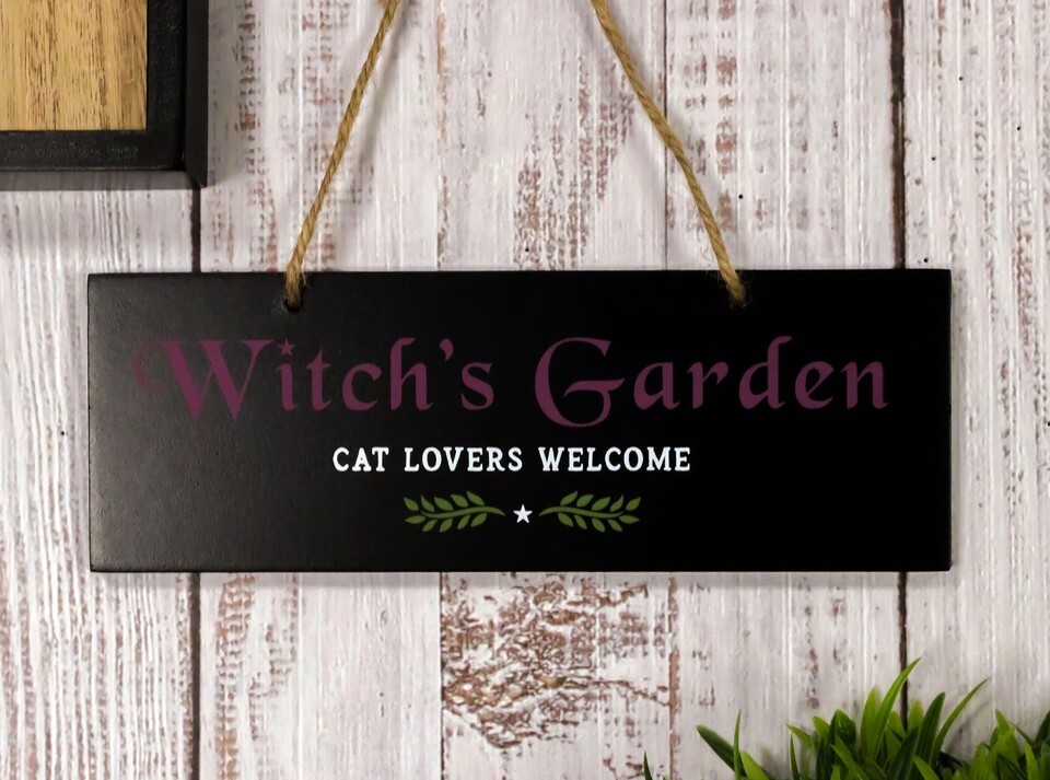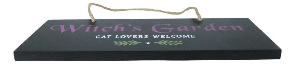 ? A black garden hanging sign garden sign is the perfect wall decor for any witch and cat lover. Features 'Witch's Garden Cat Lovers Welcome' text accented by 2 small bay leaves design. A quirky gift for a gothic garden, or a green thumbed witch!