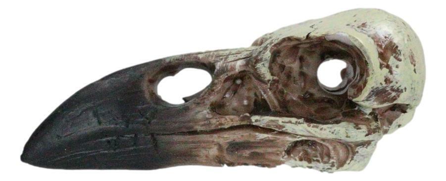? Whether you need a skeletal accessory for your costume or wish to wear one every day, the Reliquary Raven Skull Pendant is a great choice. Made from resin, this gothic pendant takes the form of a birds skull. It features a natural coloring with a black beak. The intricately detailed ravens skull has open eye sockets. These sockets allow for a chain or cord to run through the eyes. A chain or cord does NOT come included.