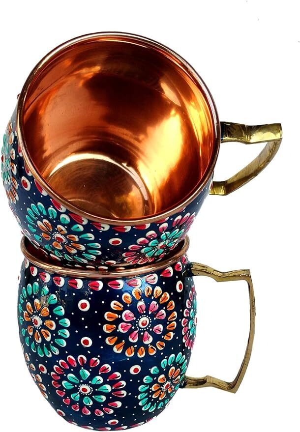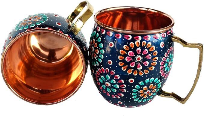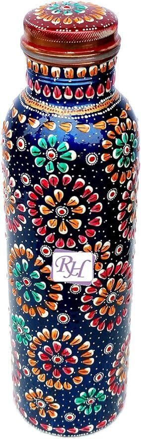 This product is a handmade water bottle and two mugs set made of copper with a hand-painted art deco design. The bottle is hand-printed and features a multicolor pattern. It is perfect for cold beverages and is ideal for various occasions such as birthdays, anniversaries, and bachelorette parties. The set is made in India and requires hand washing only.