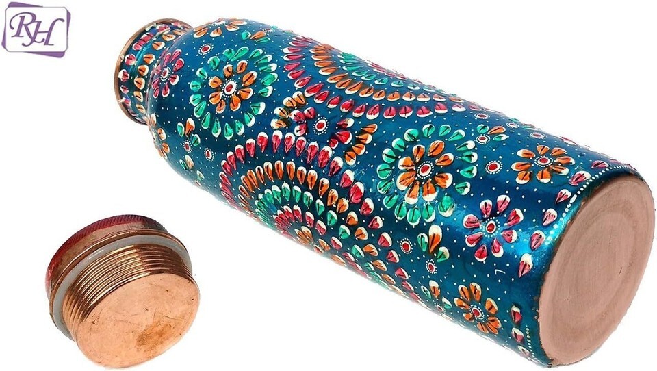 Handmade Copper Outer Hand Painted Art Work Water Bottle and Two Mugs