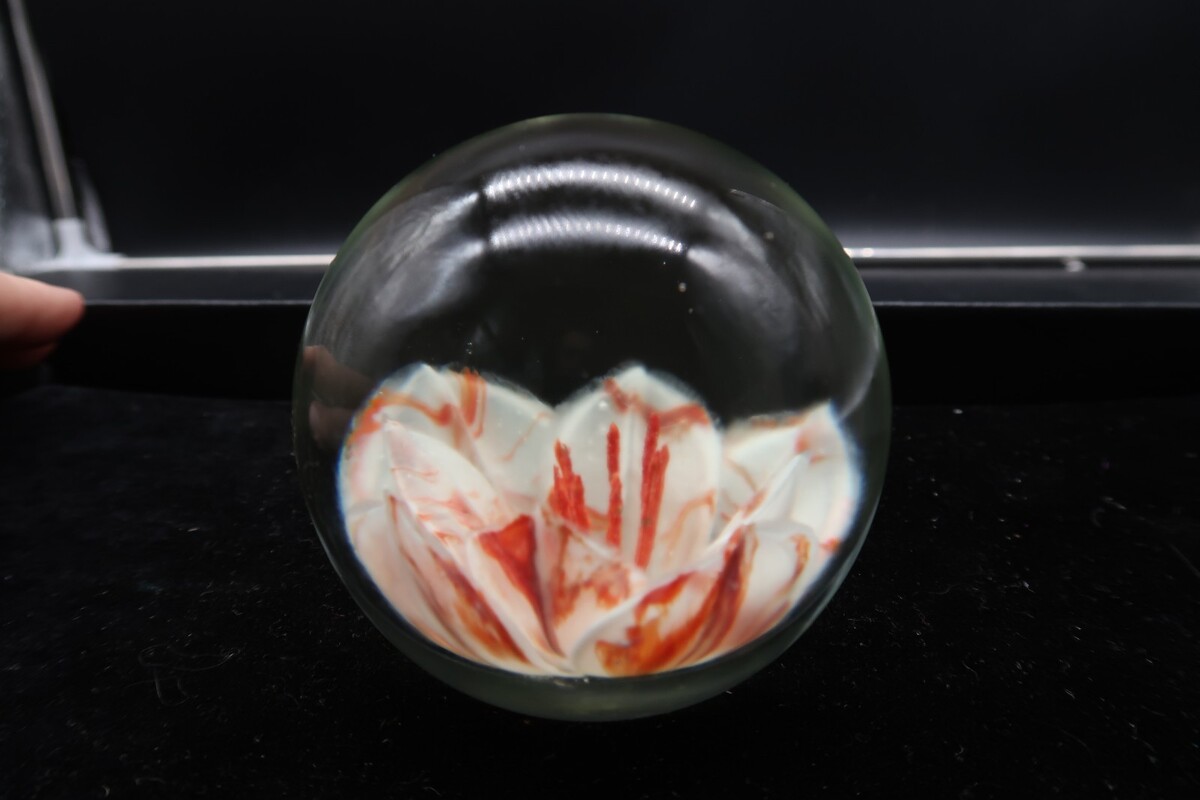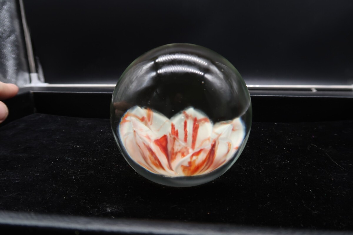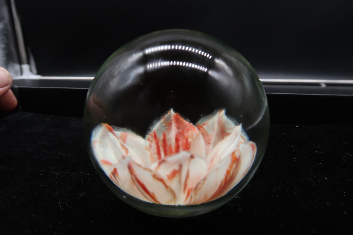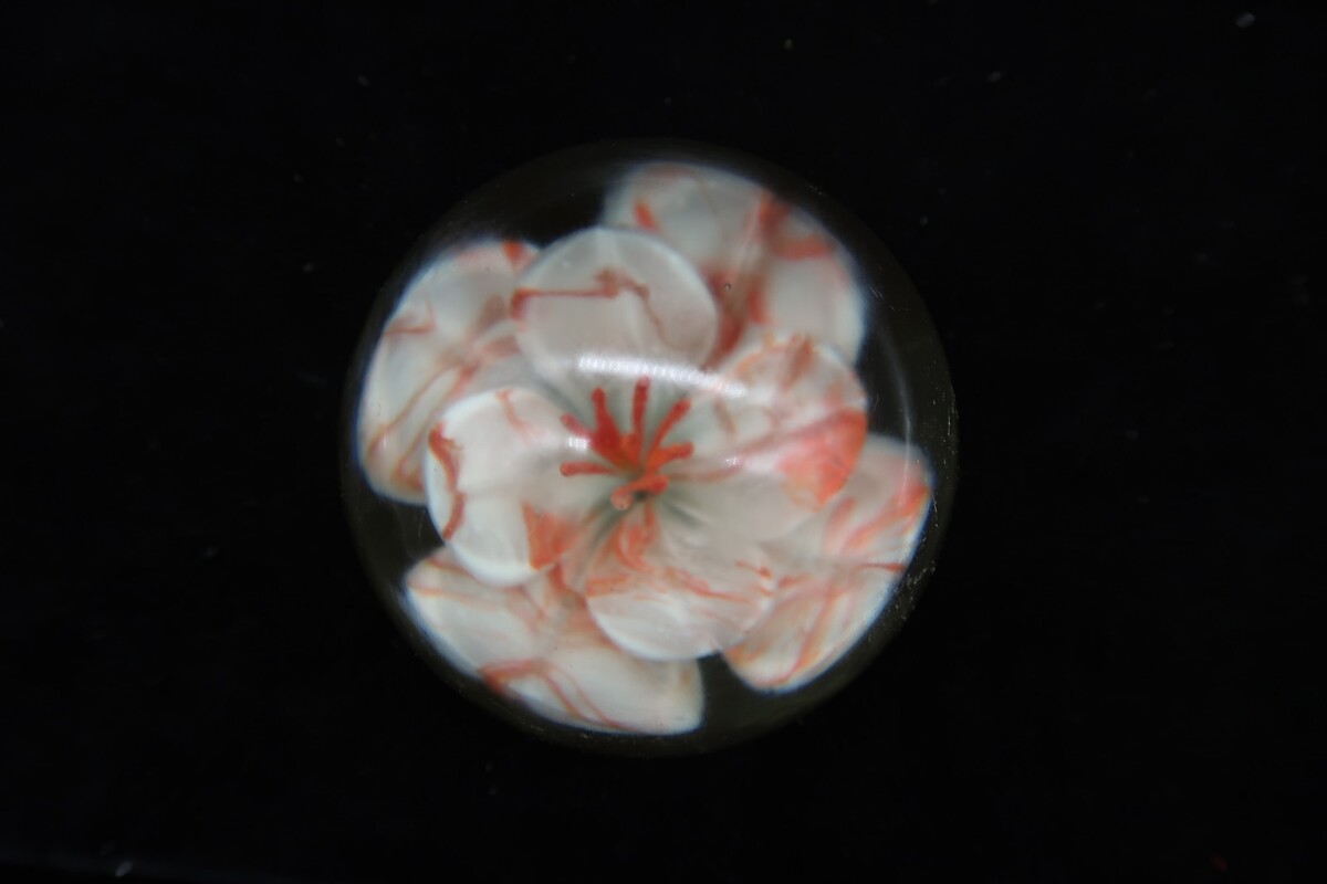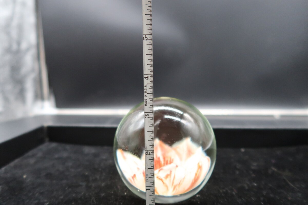 Vtg Round Glass Handmade Paperweight White & Coral Flower Unsigned 3" Unique