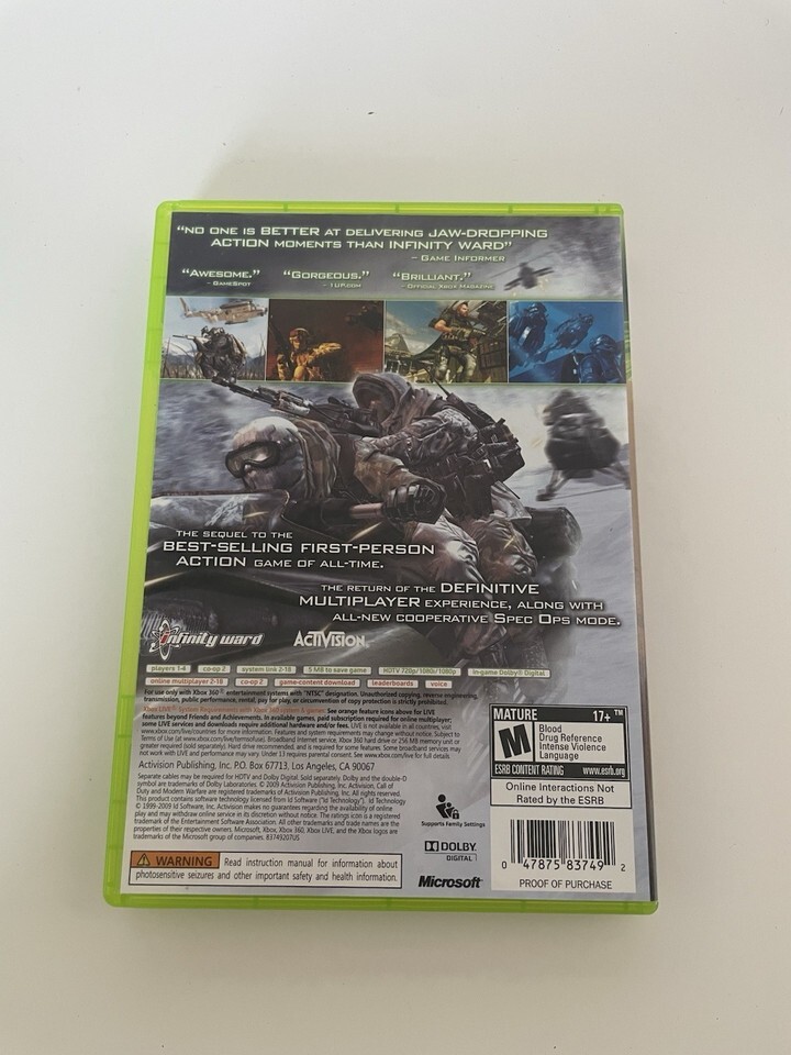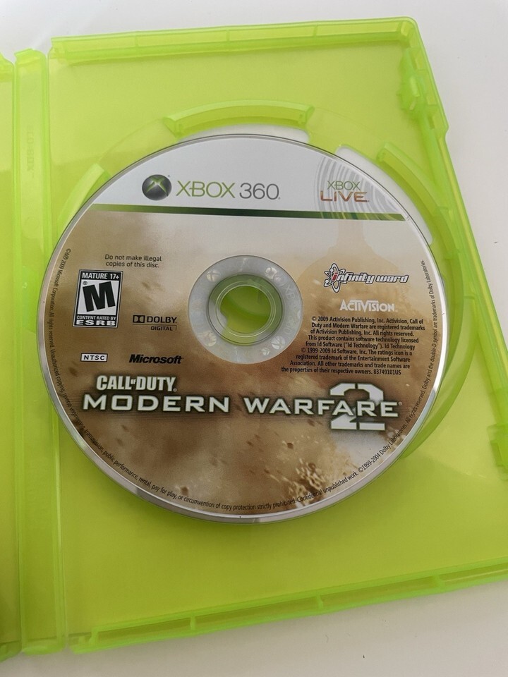 The product is a copy of Call of Duty Modern Warfare 2 for the Xbox 360, released in 2009. It includes the game disc, as well as an instruction manual to help players navigate and understand the gameplay mechanics. This action-packed first-person shooter game is part of the popular Call of Duty series, known for its intense graphics and thrilling multiplayer gameplay on the Xbox 360 platform. Perfect for fans of modern warfare combat simulations.