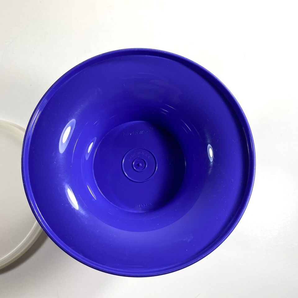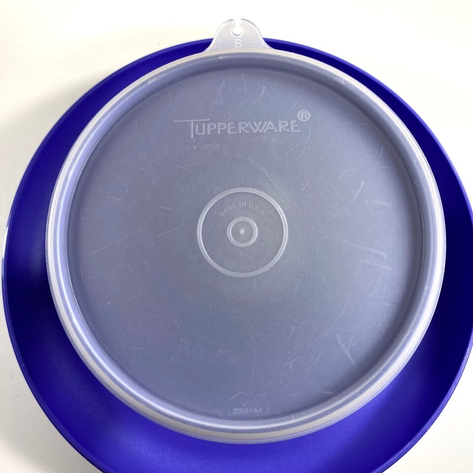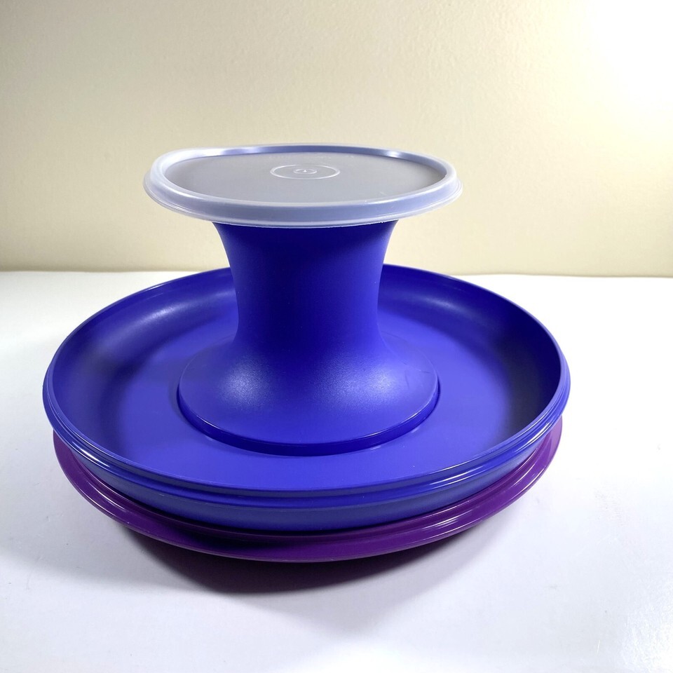 Tupperware 4 Pc. Serve-It-All Pedestal Cake Stand and Chip Dip in Blue and Purple with Lid. Marked on bottom 1531-6, 1532-6 and 1533-5 Made in U.S.A.