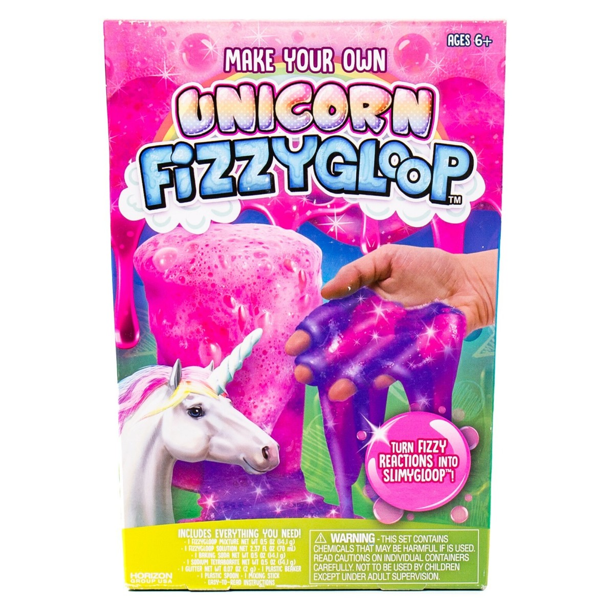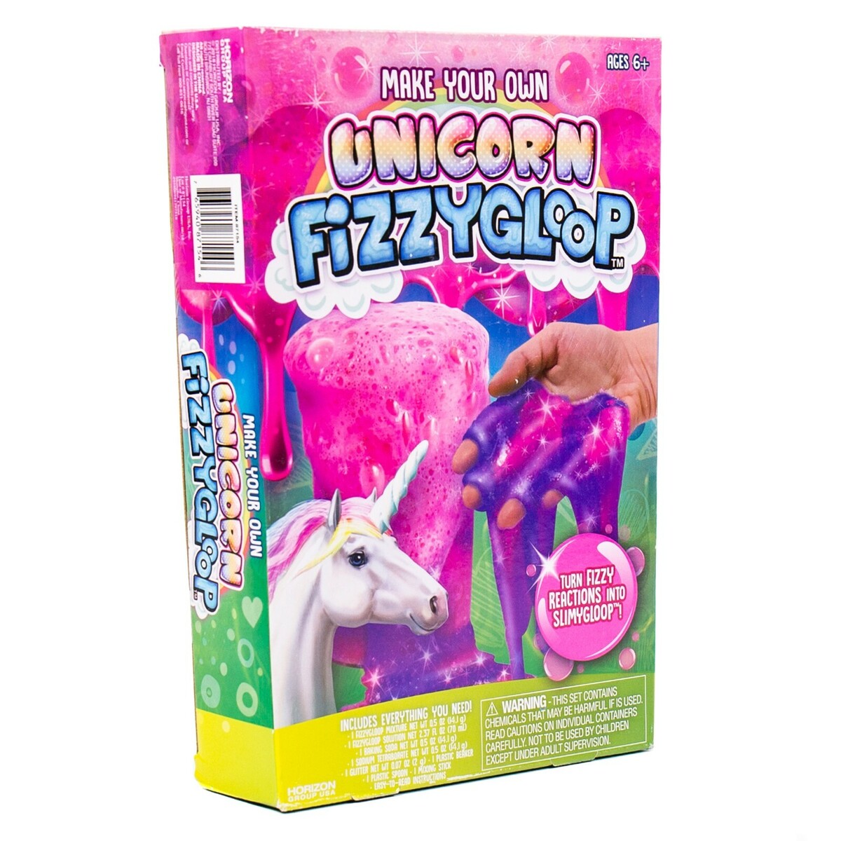 This is for a brand new box of Horizon Group Make Your Own Unicorn Fizzy Gloop Slime Craft Kit Watch an eye-catching eruption of slime as you create a fun, fizzing, and slimy explosion with Unicorn FizzyGloop?. Simply combine the included ingredients watch your mixture overflow with fizzing slime that turns into ooey, gooey SLIMYGLOOP?! Explore an interactive way introduce kids to basic chemistry skills. Recommended for ages 6 and up. Mix simple ingredients to create a fizzy explosion that turns into ooey, gooey SLIMYGLOOP Once your fizzy explosion is over, stretch, roll and twist your Fizzygloop for a gooey sensory experience Explore an interactive way introduce kids to basic chemistry skills Kit Includes: Fizzygloop? Solution, Glitter, Baking Soda, Fizzygloop? Mixture, Plastic Beaker,