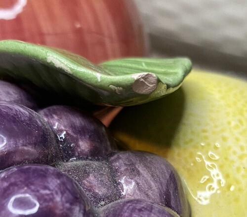 This soup tureen is in pristine condition, with the exception of a minuscule chip on the very tip of the upper leaf. The chip is hardly noticeable without a closer inspection, and it does not affect the functionality or appearance of the item. You can see the chip in the final picture, where I tried to capture it as accurately as possible.