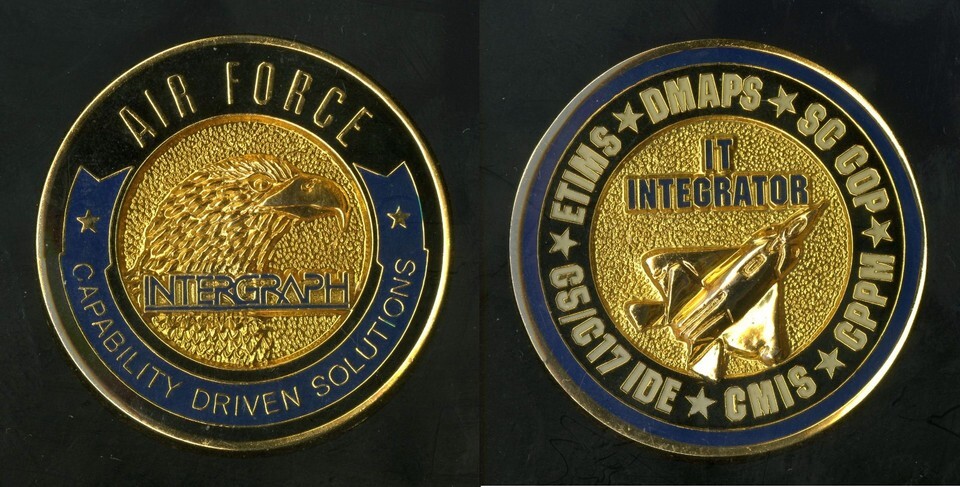 This is a Challenge Coin of AIR FORCE INTERGRAPH CAPABILITY DRIVEN SOLUTIONS IT INTEGRATOR ETIMS DMAPS SC COP C5/C17 IDE CMIS