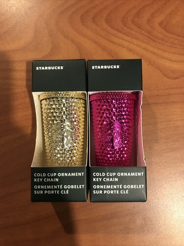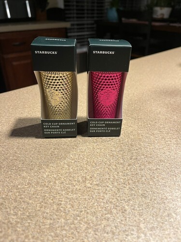 Two Starbucks 2022 Metallic Gold + Sangria Pink Cold Cup Ornament Key Chain
