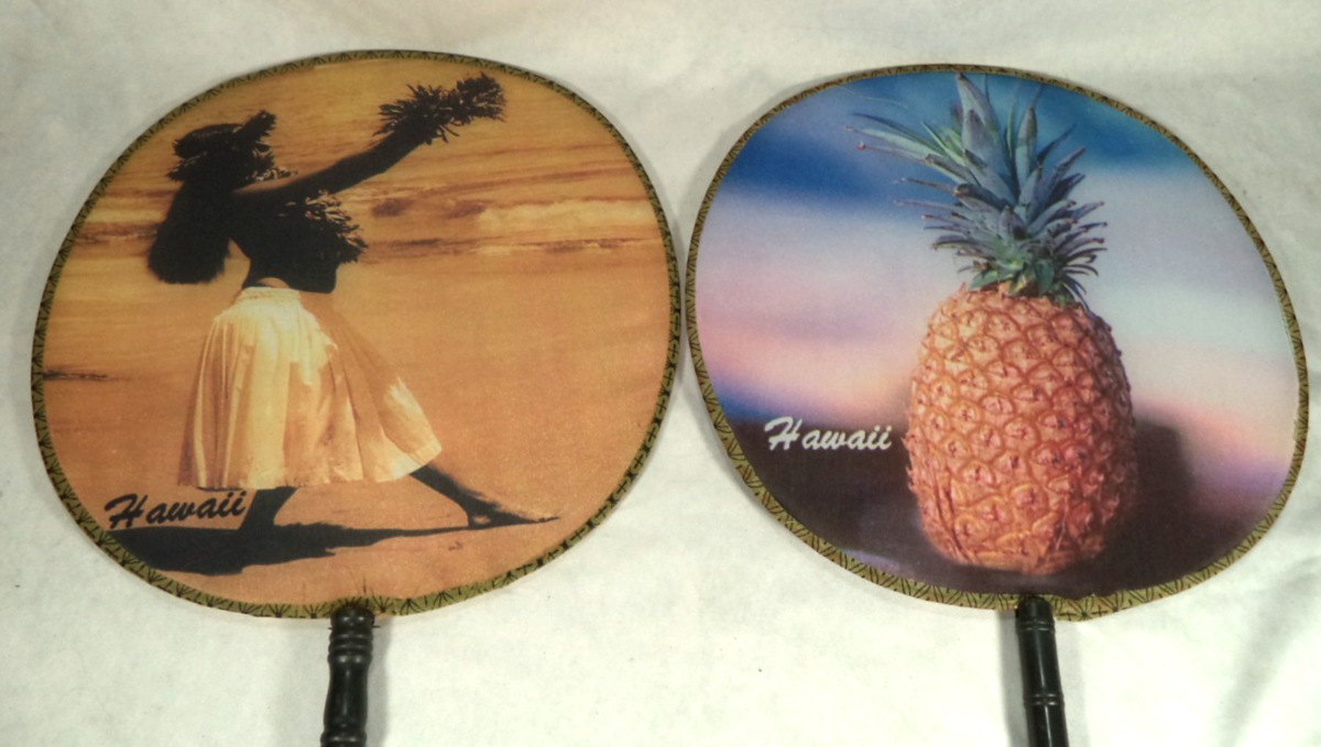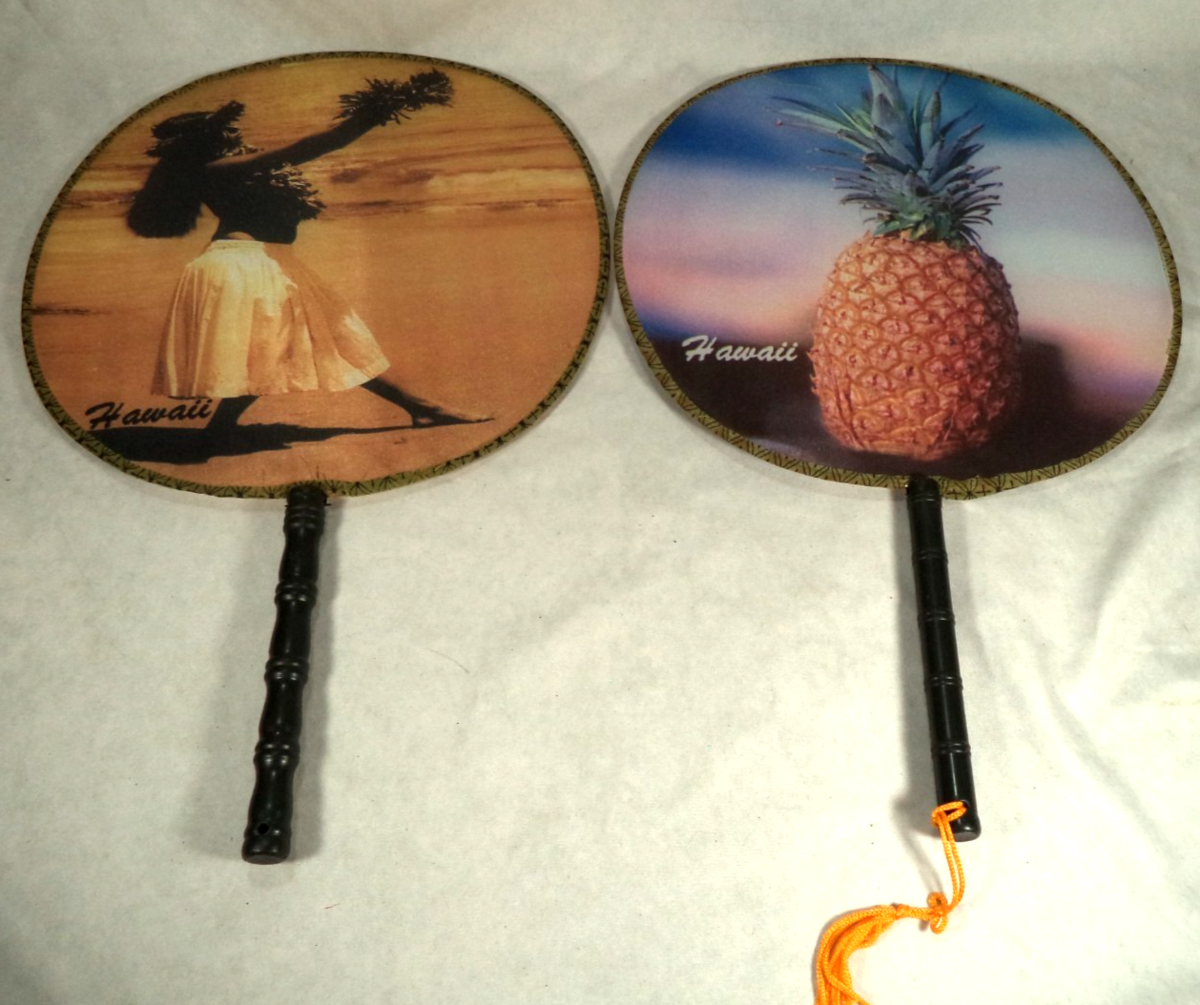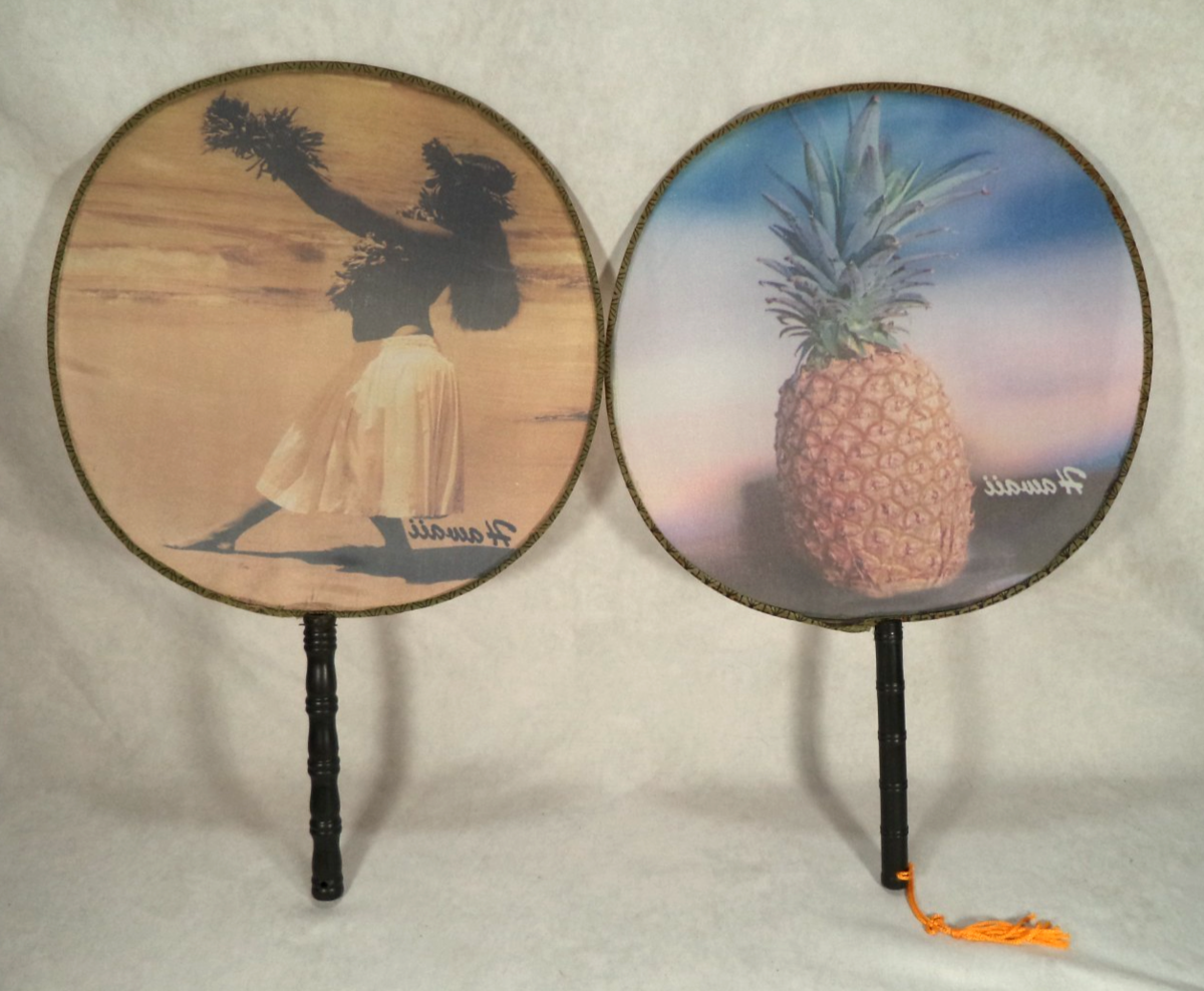 Description: This vintage set of 2 nylon hand fans features a Hawaiian design with a hula girl and pineapple motifs, measuring 13? long and 9? wide. Made in the United States, these handmade fans showcase Hawaiian culture and are a unique addition to any collection of Hawaiian collectibles. The ownership history of these fans adds to their charm and authenticity, making them a special and culturally significant item for fans of Hawaiian traditions and artwork.