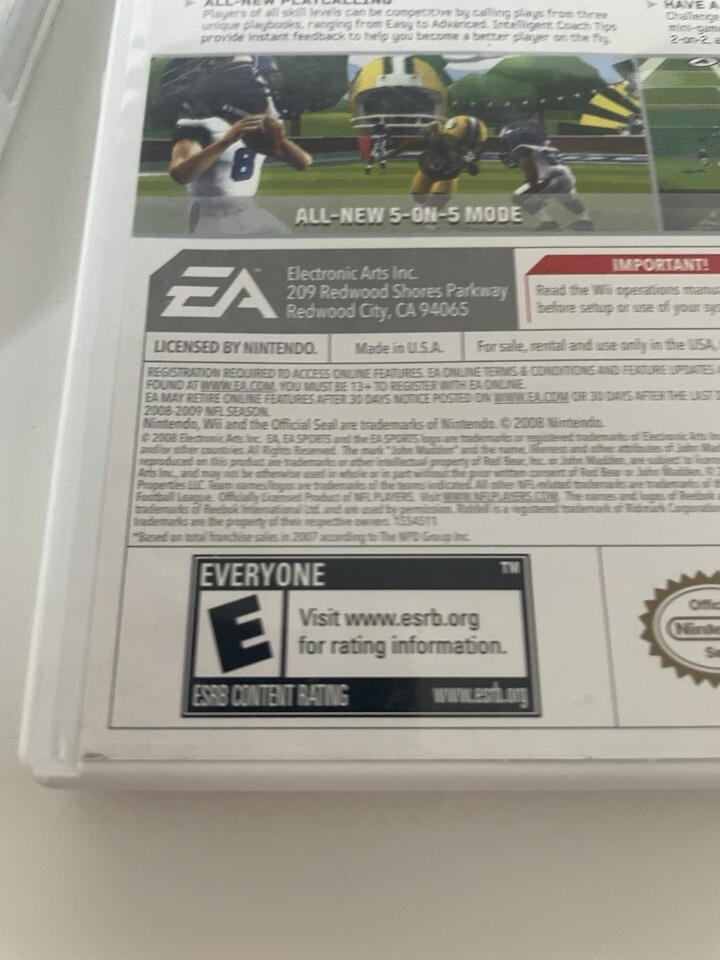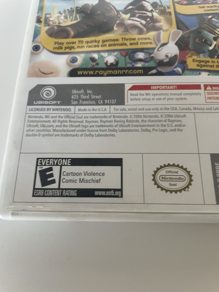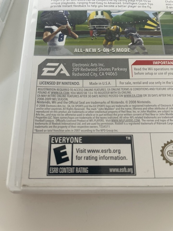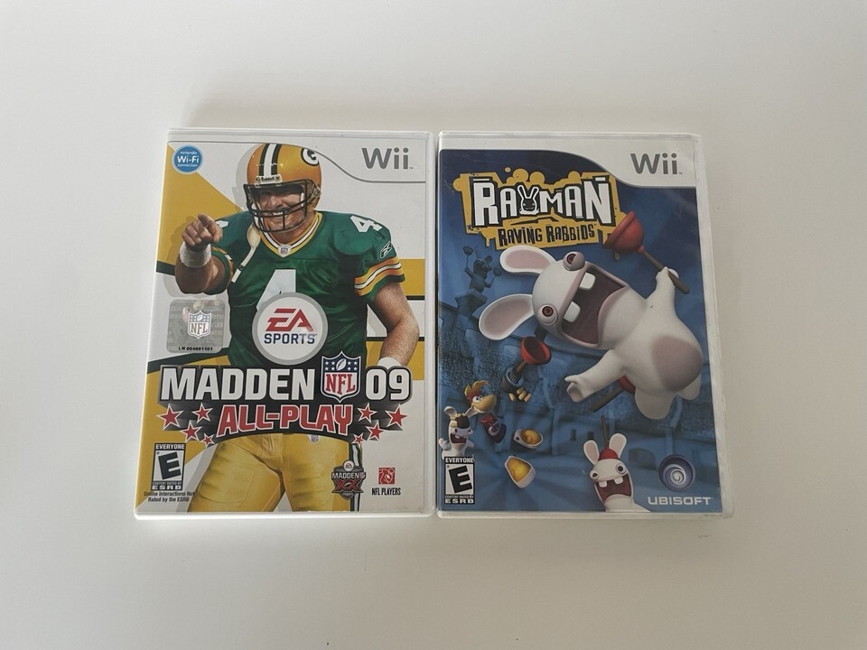 The product is a pair of Nintendo Wii games, including "Rayman Raving Rabbids" and "Madden 09 All-Play." Both games are published by Nintendo and designed for the Wii platform. "Rayman Raving Rabbids" combines platforming gameplay with a colorful and quirky aesthetic, while "Madden 09 All-Play" offers sports enthusiasts the opportunity to play various football modes with intuitive controls. These games provide hours of entertainment for players of all ages on the popular Nintendo Wii console.