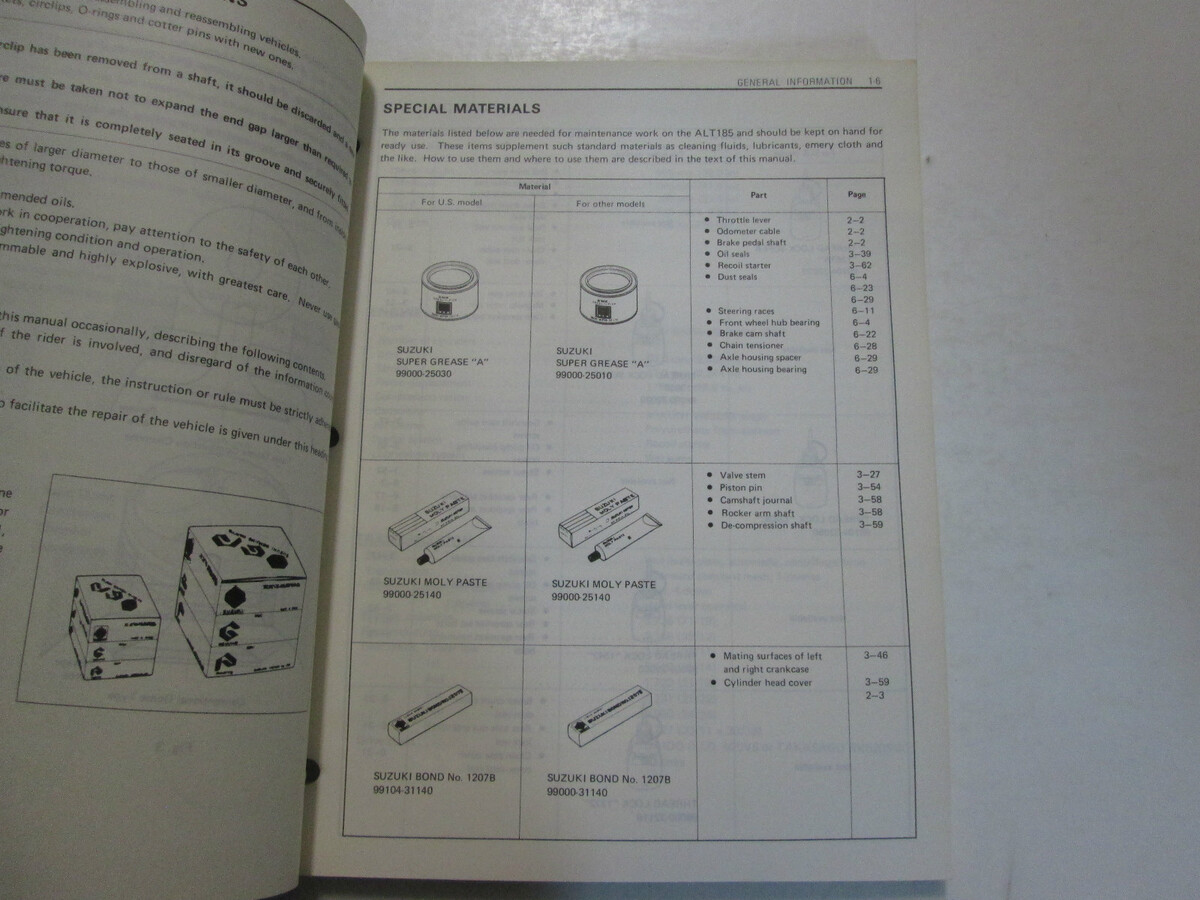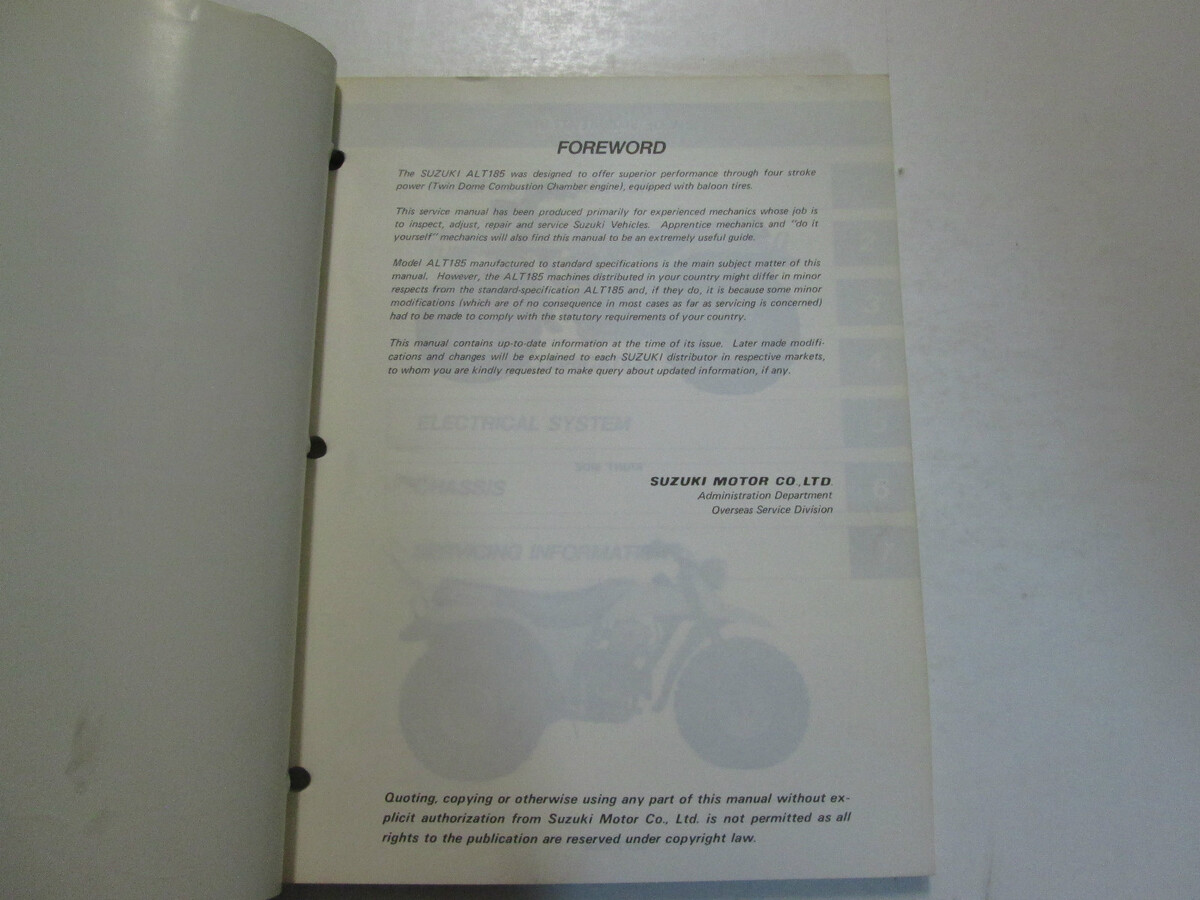 step by step instructions, assembly/dis-assembly, exploded illustrations/diagrams/troubleshooting, great manual to have when owning a ALT185 and will keep your SUZUKI on the road. This manual will save you money in repairs/service.