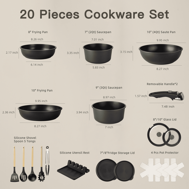 20-Piece Pots and Pans Set, Nonstick Cookware Set with Detachable Handles, Oven