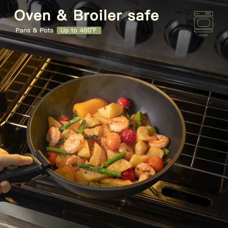 Thanks to its stackable design, the entire set stores neatly to maximize space, while compatibility with induction, gas, ceramic, and electric stovetops ensures even heat distribution for reliable cooking results. Built from high-quality aluminum and oven-safe up to 400F, this cookware is made to last through years of culinary adventures. With Astercook's commitment to quality and customer service, you can cook confidently, knowing that each meal will be a success.