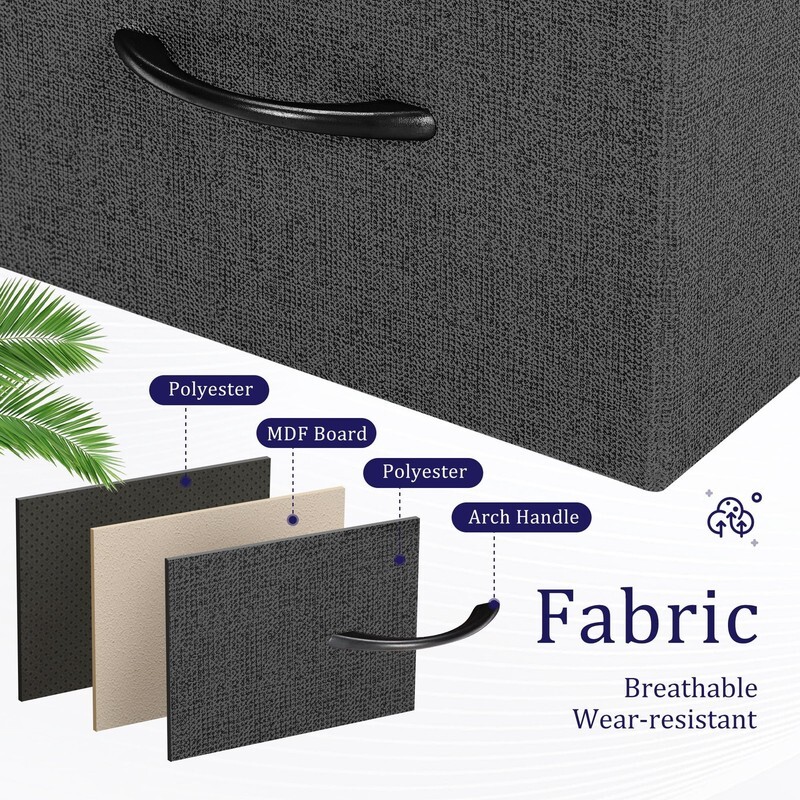 Constructed with a high-quality steel frame and premium non-woven fabric, this storage dresser ensures a long lifespan. The thick wood board provides excellent support for your daily necessities, while the metal foot guarantees stability.